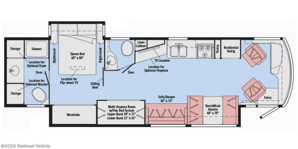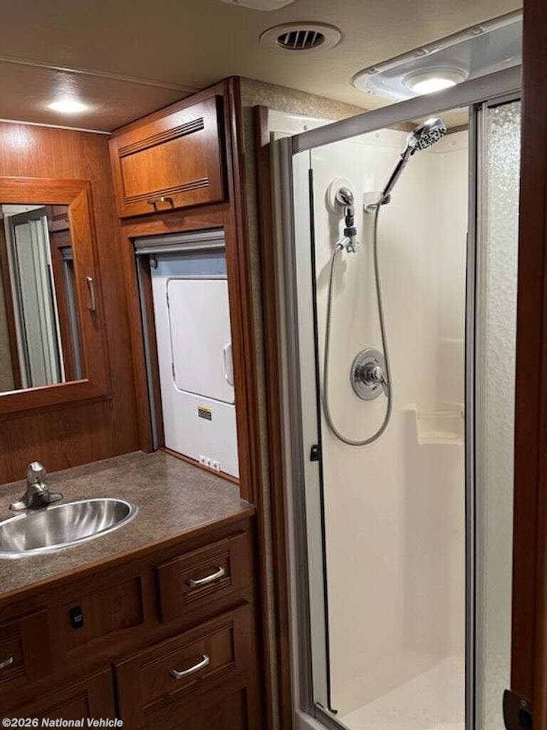 This coach features a bathroom complete with shower, toilet, and a sink with a medicine cabinet above for your convenience. There is also a half bath mid coach!