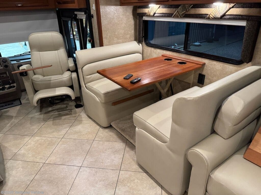 Step inside and take a look back at all of the convenient features that would make any journey enjoyable. The kitchen area features everything you need to prepare great meals on the go including a sink, a three burner range with microwave/convection oven, and a residential refrigerator/freezer. There is also plenty of storage for all of your dry and canned goods. Have a seat at the comfortable dinette, where you can enjoy meals with your family.