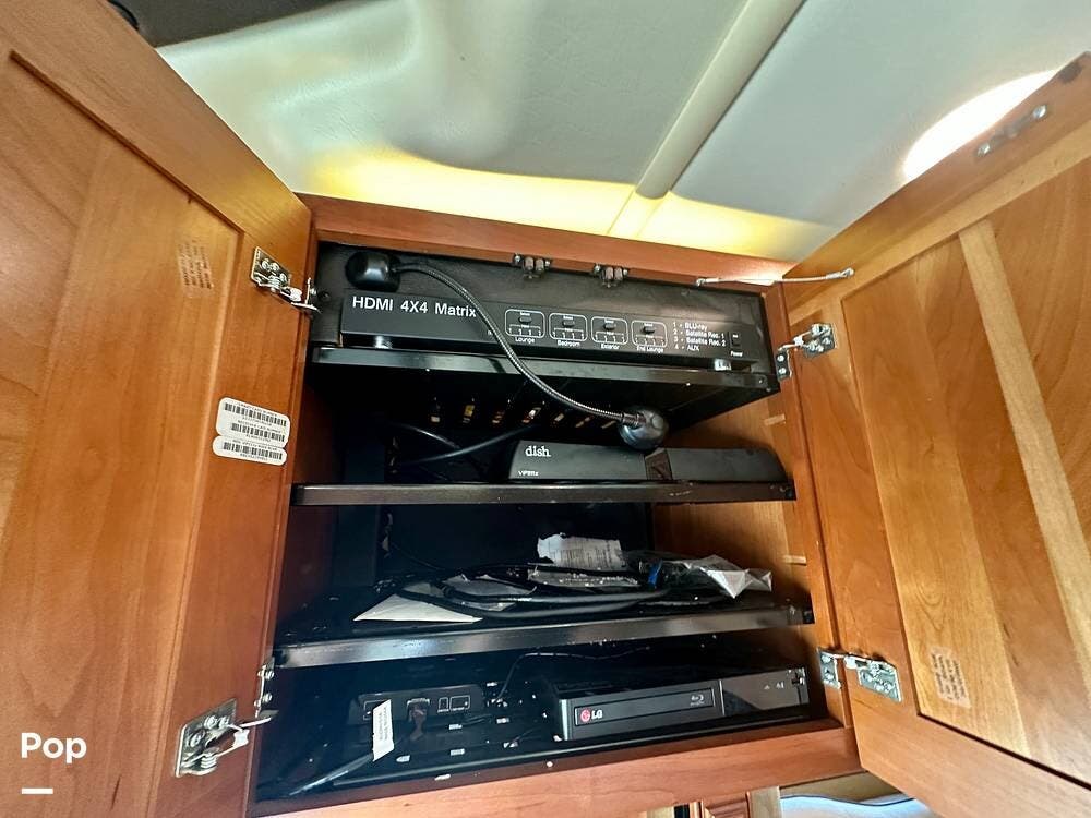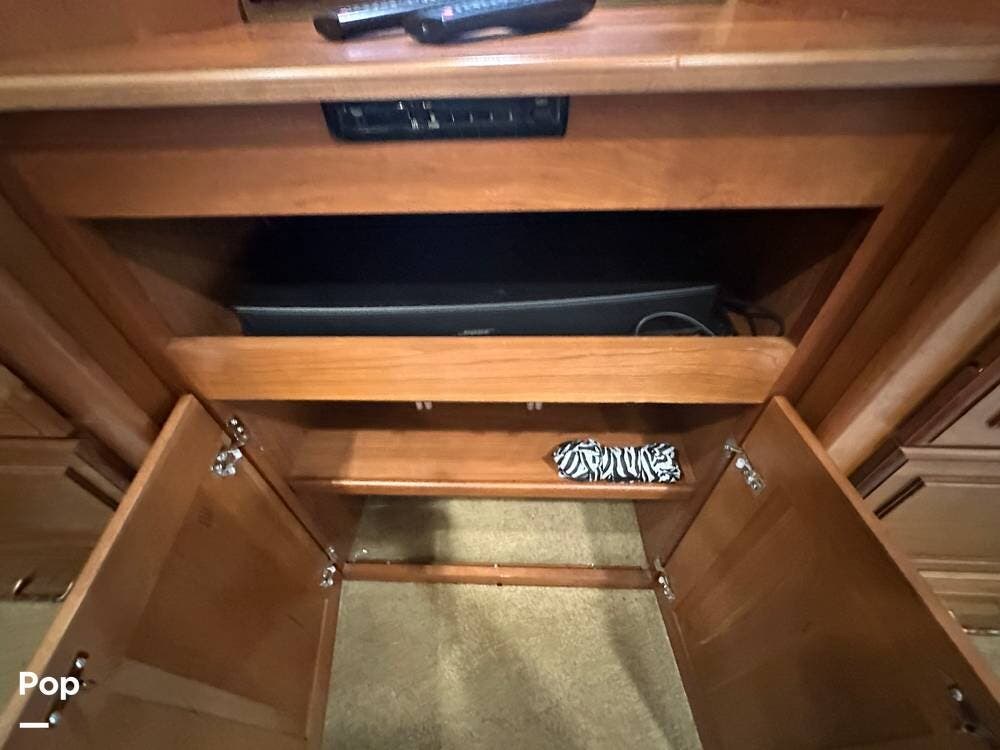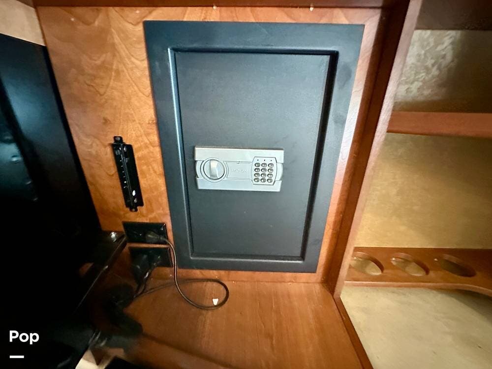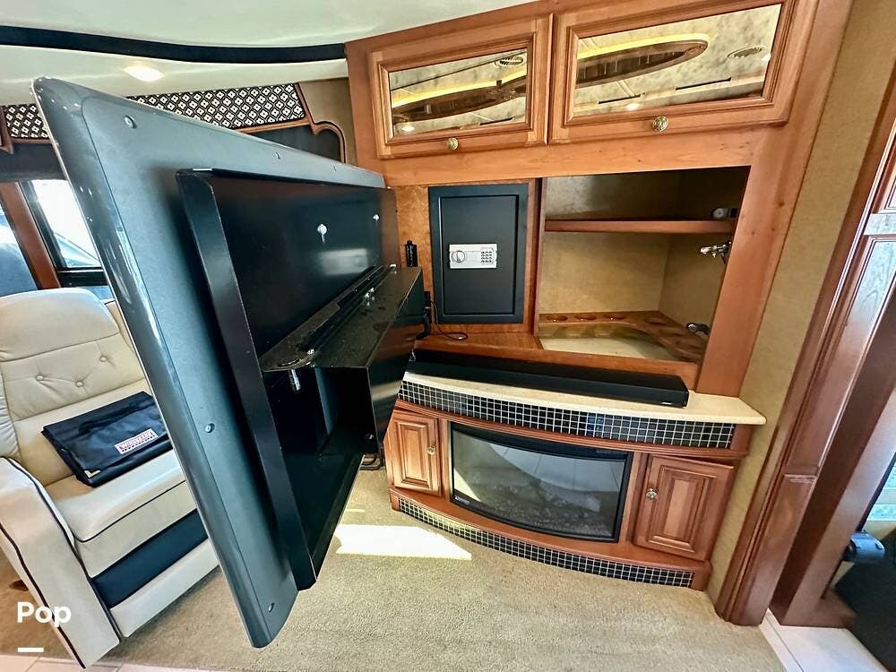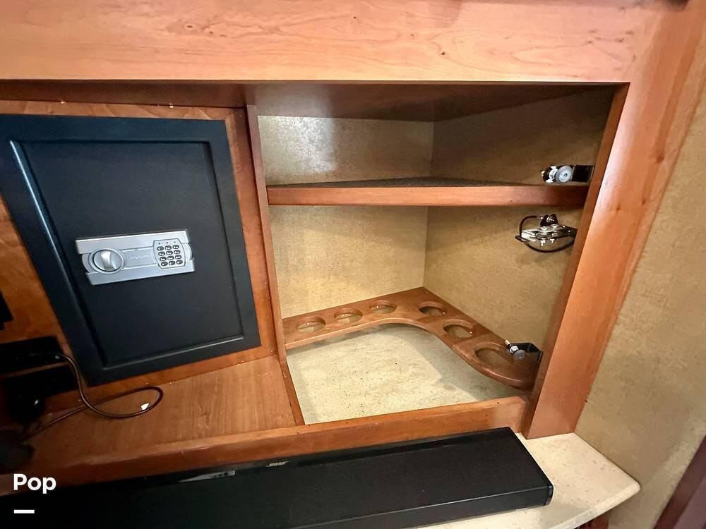 The sofa easily converts to a queen bed with the touch of a button. The living area TV opens in the back, where a security safe and bar area to hang your wine glasses and bottles are hidden.