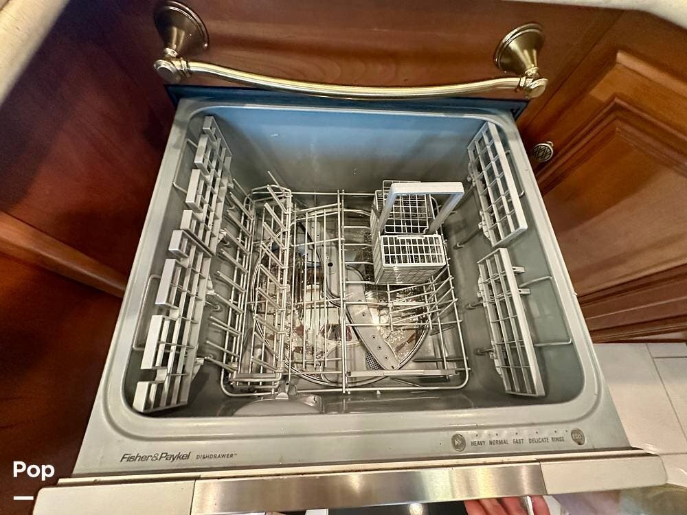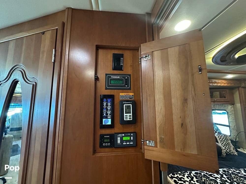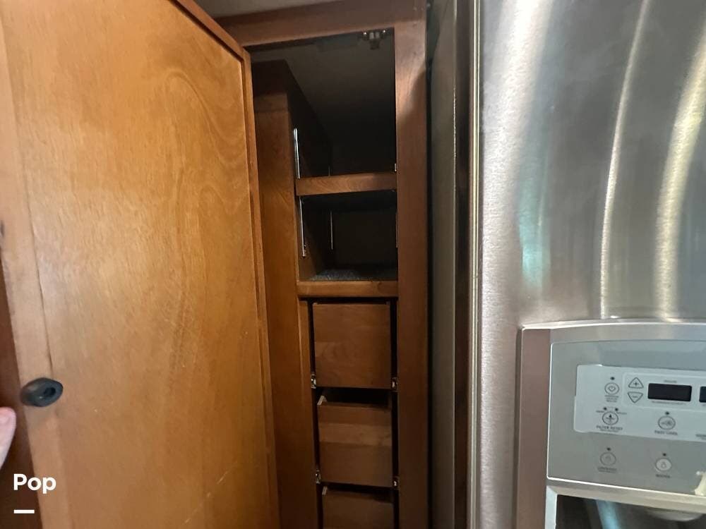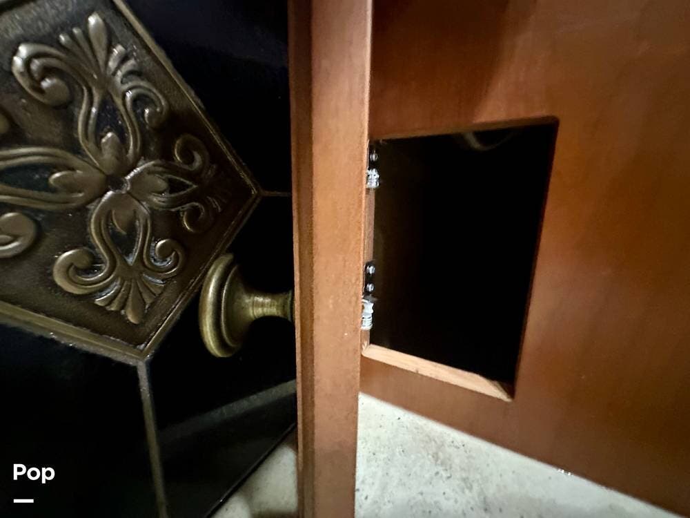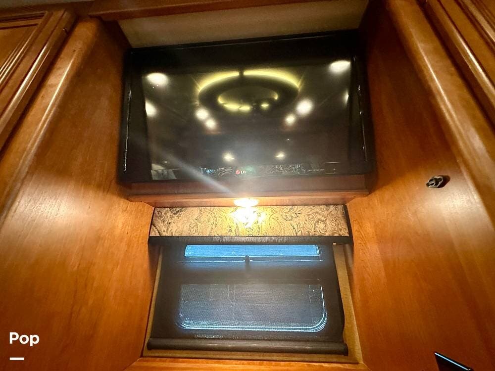 The sofa easily converts to a queen bed with the touch of a button. The living area TV opens in the back, where a security safe and bar area to hang your wine glasses and bottles are hidden.