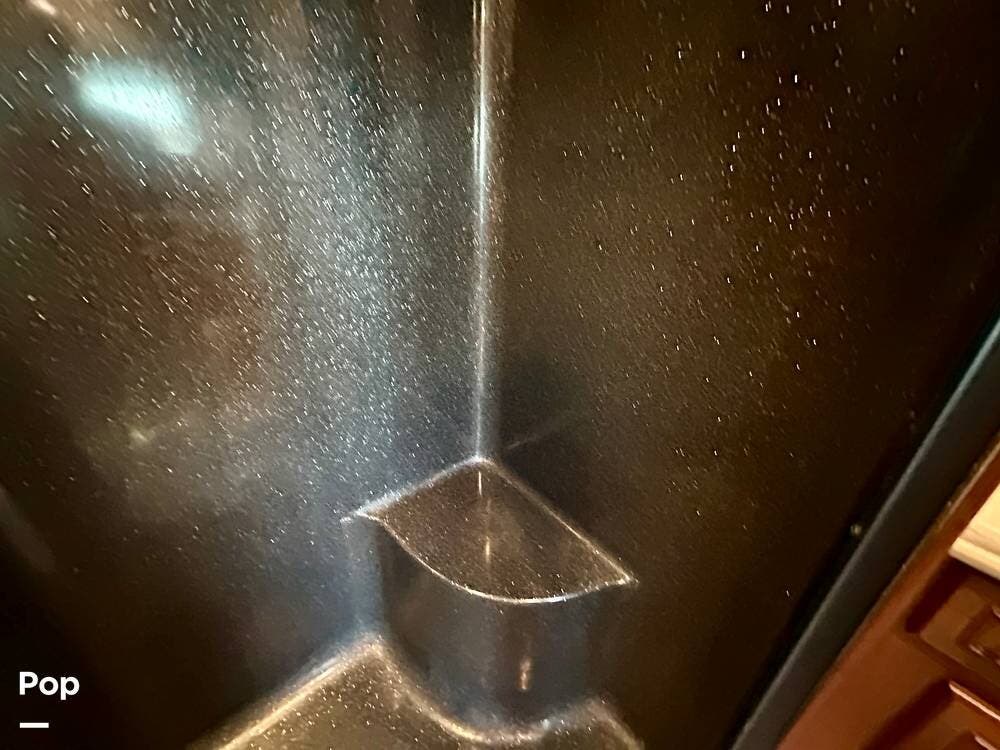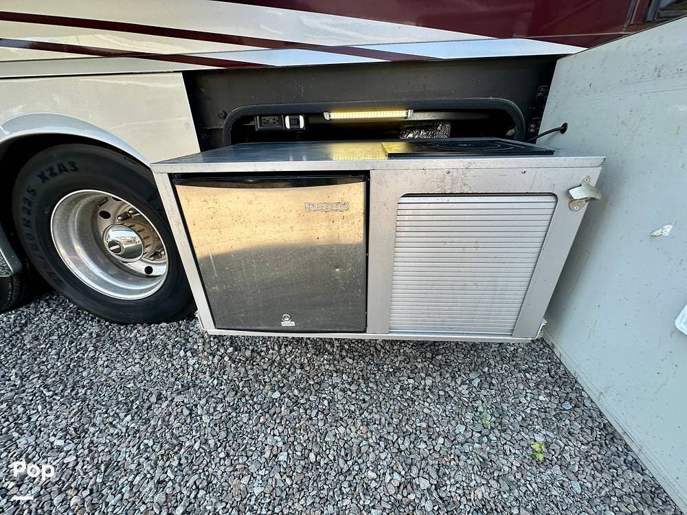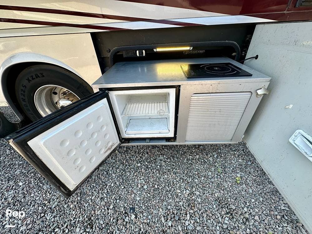 The outside has lots of storage compartments below with a pass-through slider, outdoor TV, outdoor induction stove, and fridge. When on the road, you can conveniently pull up to the fuel station and fuel from either side.