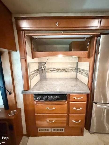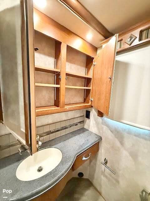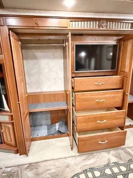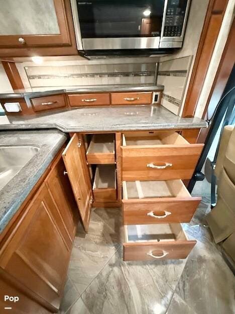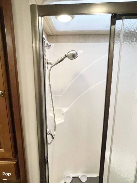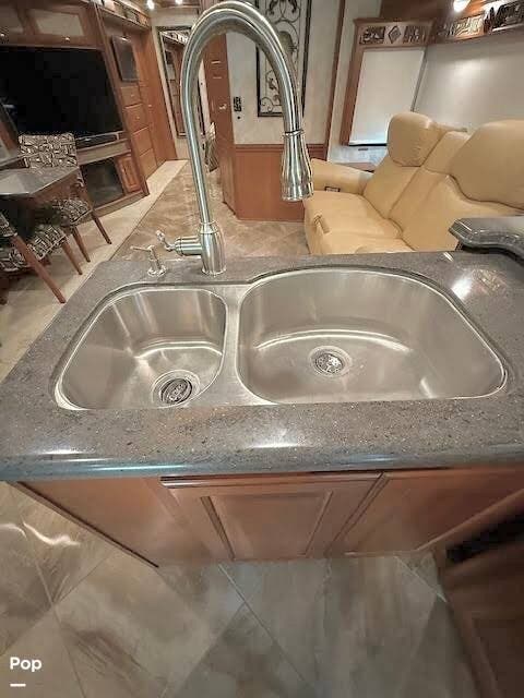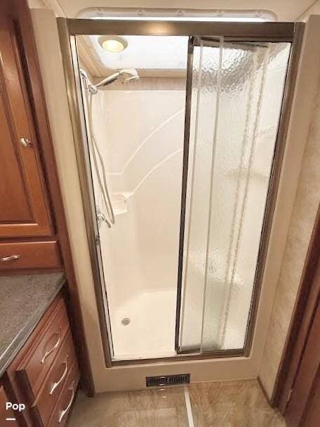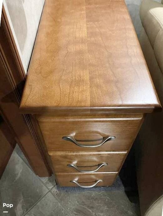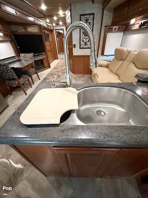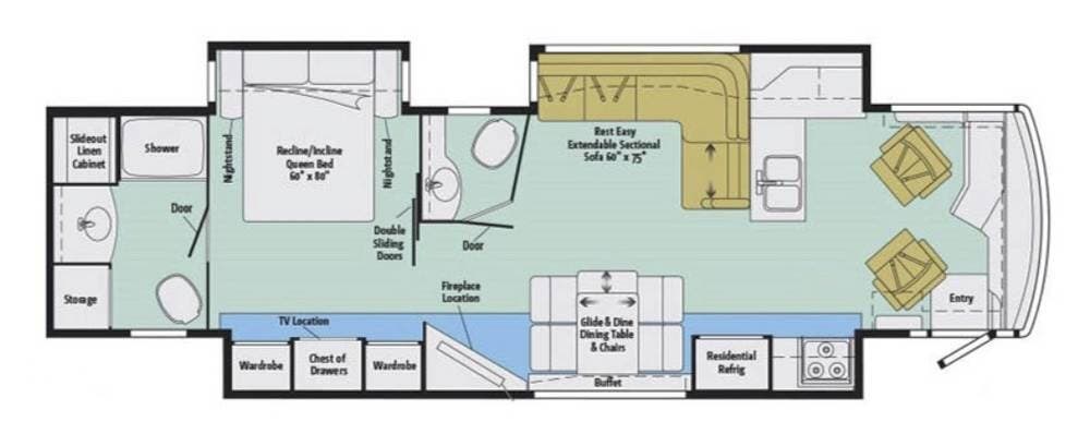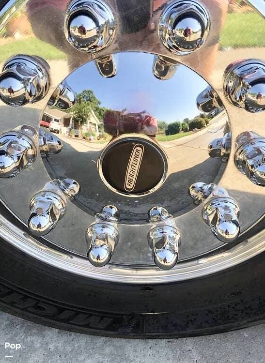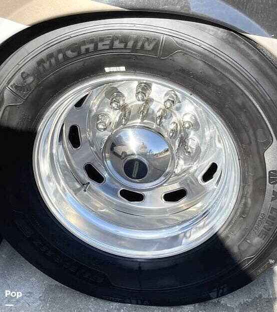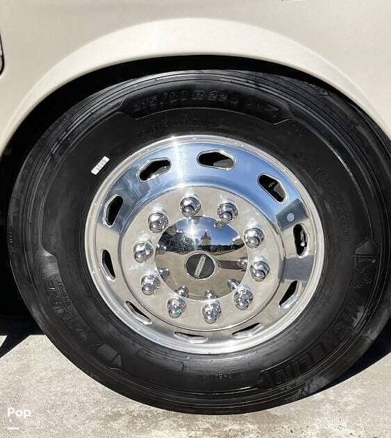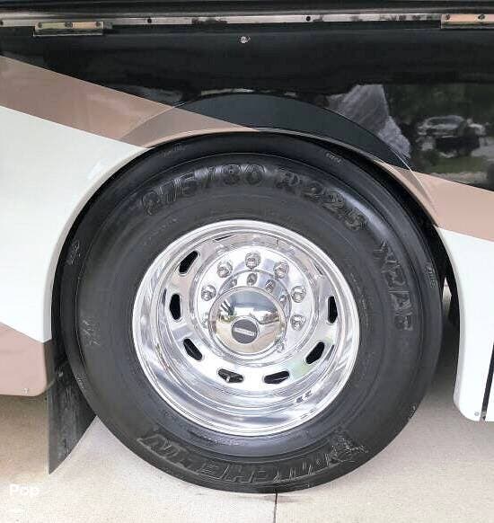 The Journey is powered by a Cummins ISL 8.9L Turbocharged Engine with 400 HP. It can tow up to 15,000 lbs and has a fuel capacity of 100 gallons. The chassis is built with Freightliner's V-Ride suspension, and the front tires have Tyron fun flat protection. This coach is a joy to drive.