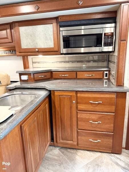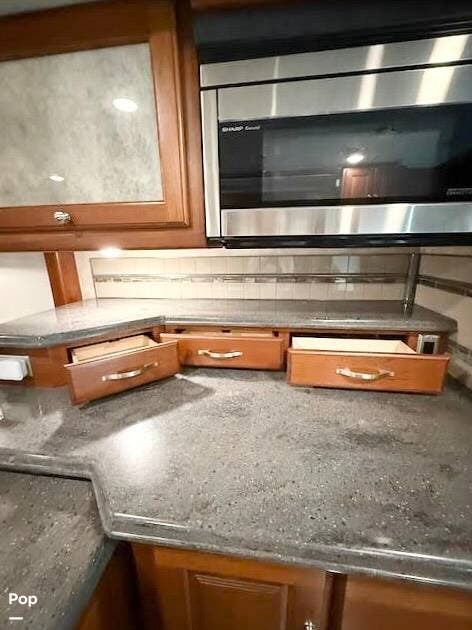 The gourmet kitchen features a partial island sink for optimal space management, a microwave/convection oven, ample counter space, and a residential-sized refrigerator/freezer.