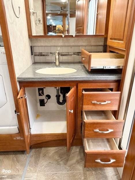 Full size Motor Coach with expansive living space, 1-1/2 baths, fireplace, washer and dryer, and Cummins 400 HP engine!