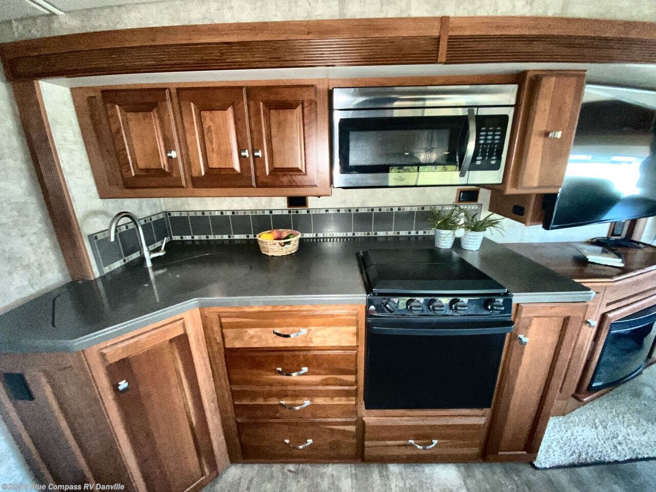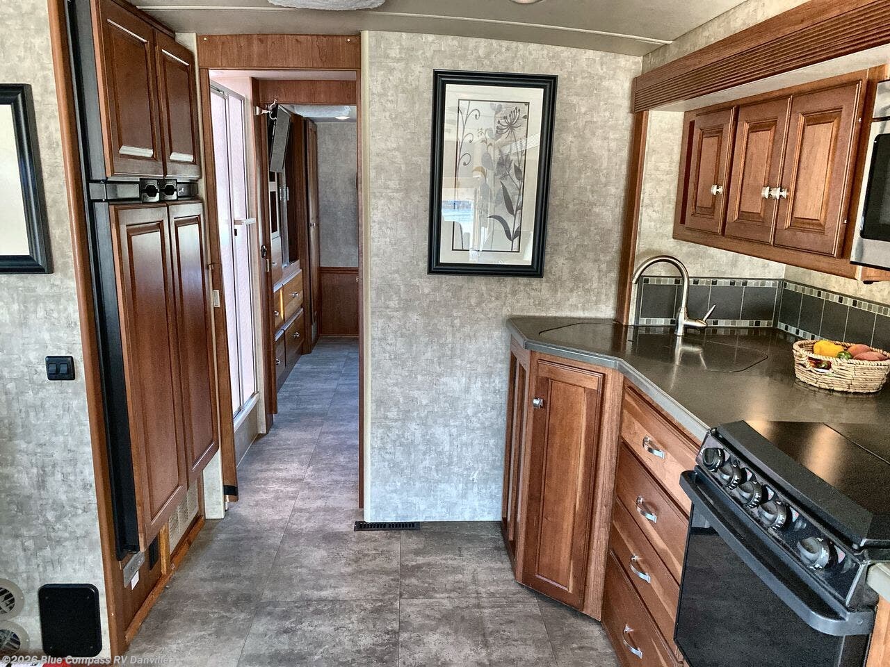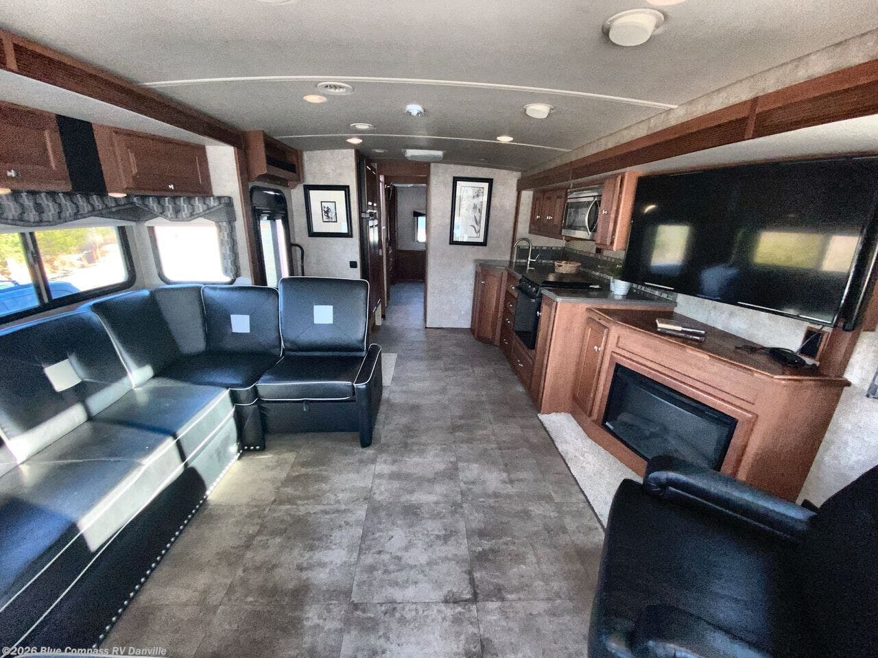 Step inside and find a large slide out inLounge to your right featuring seat belts, and the ability to extend for added seating. There is a slide opposite that features an inTable, recliner, and 48" HDTV with electric fireplace below. You will also find in this large slide out part of the kitchen area which includes overhead storage, counter space, a three burner range, and a double kitchen sink. The 4-door refrigerator/freezer is opposite just to the left of the main entrance.