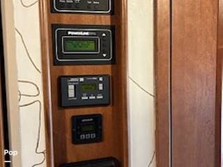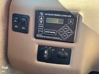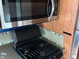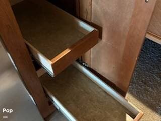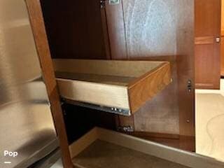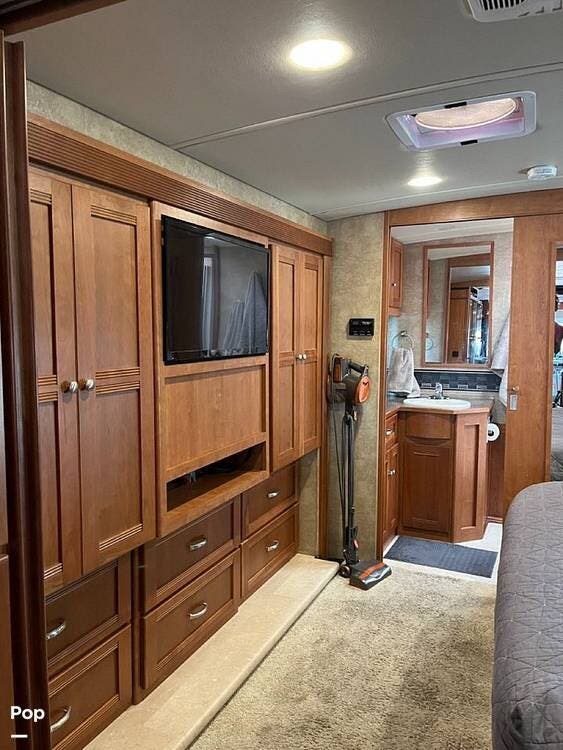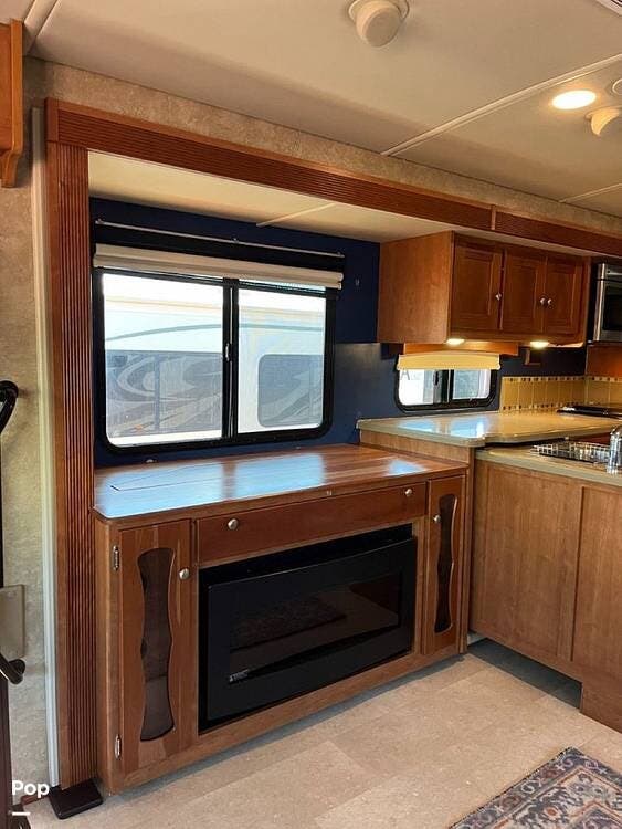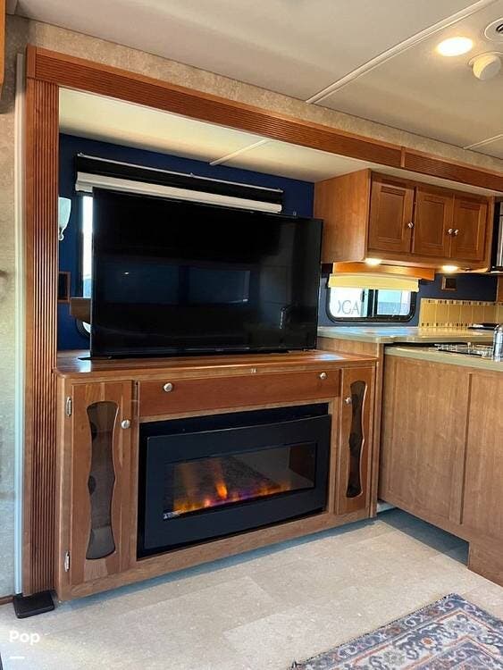 The living room has a telescoping flat-screen TV and an entertainment center, perfect for movie nights or watching your favorite shows on the road. Built into the entertainment center are an electric fireplace and dual wine racks.