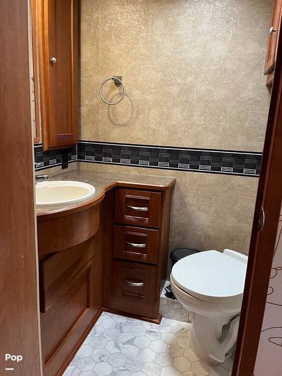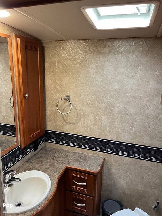 The 36Z features one full master bath in the rear and a spacious half bath for guests located just off the living area. The master bathroom includes a large shower, a porcelain toilet, and a solid-surface vanity with a sink. It also includes plenty of storage and cabinet space and a sliding door for privacy from the bedroom.