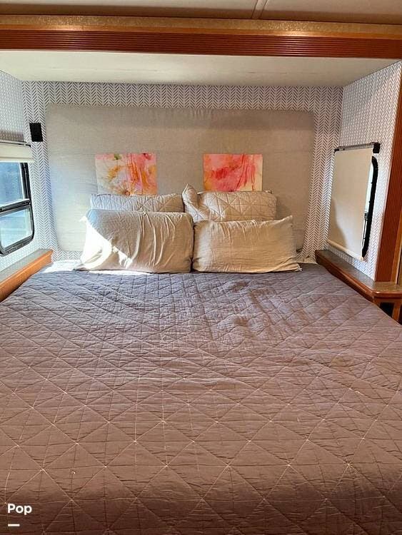 The rear bedroom is a tranquil retreat, featuring an upgraded king-sized bed with a premium mattress. There are ample storage options, including a large wardrobe and overhead cabinets. The bedroom has its own flat-screen TV, allowing you to unwind with your favorite shows or movies in bed.