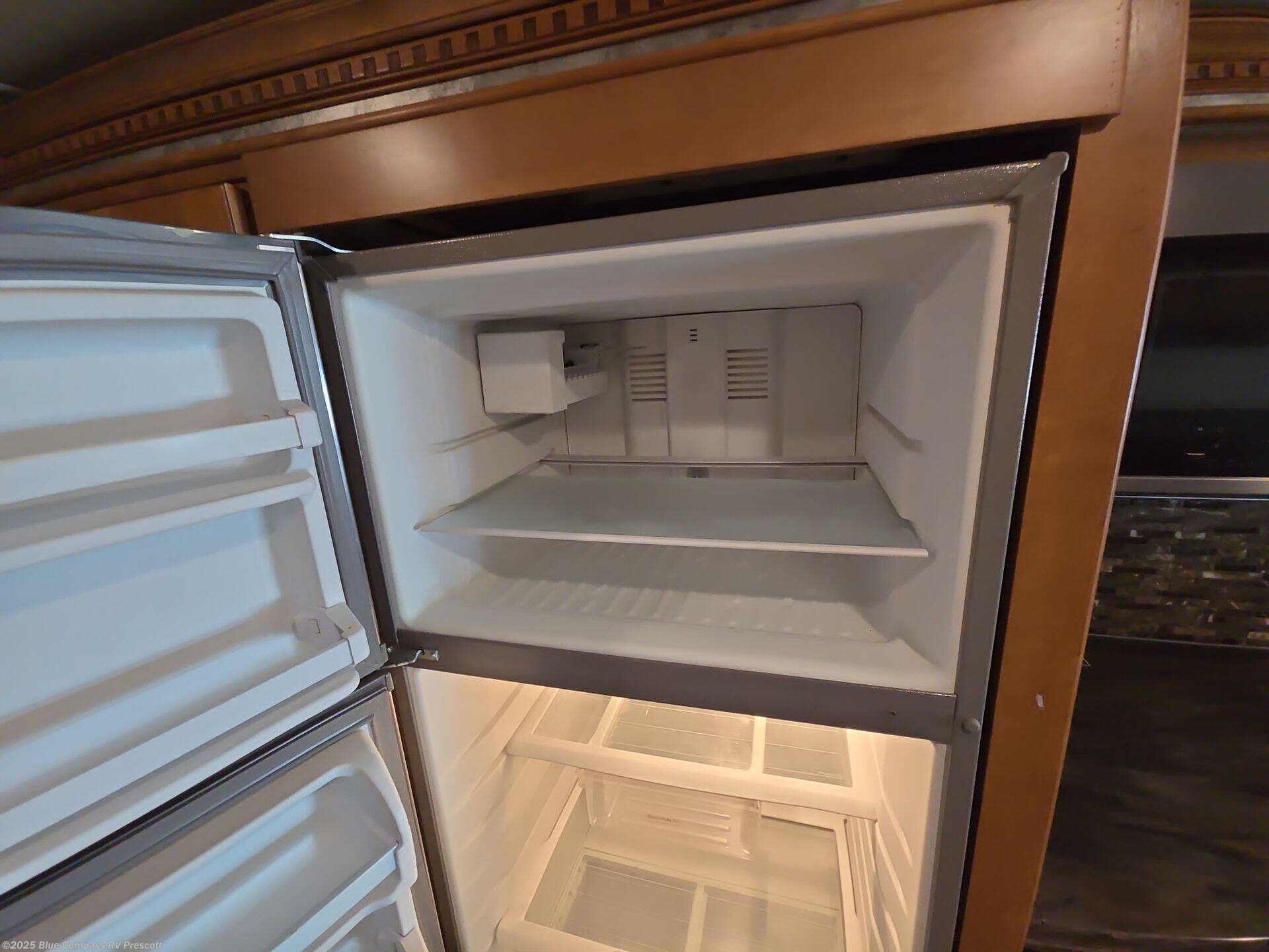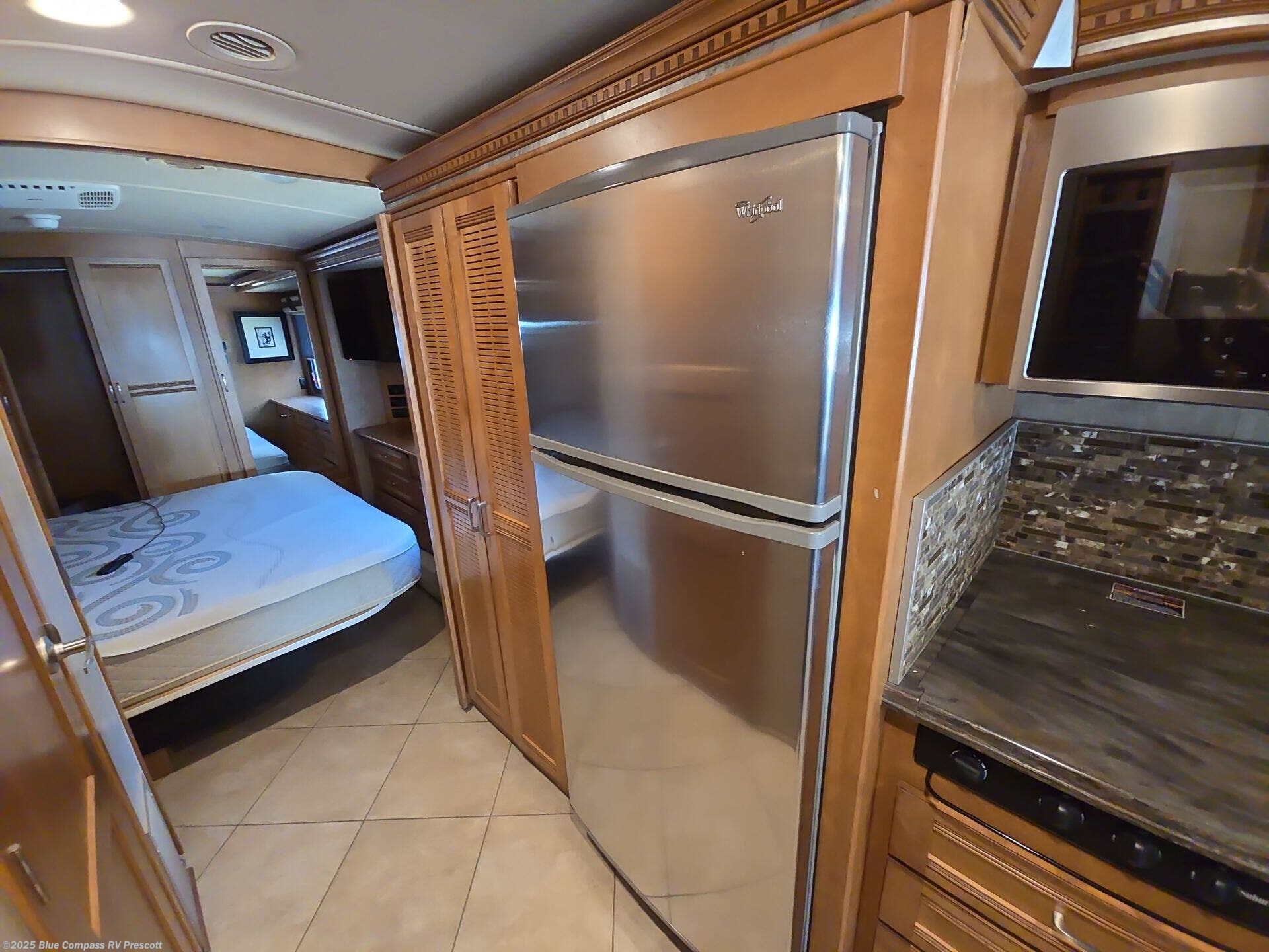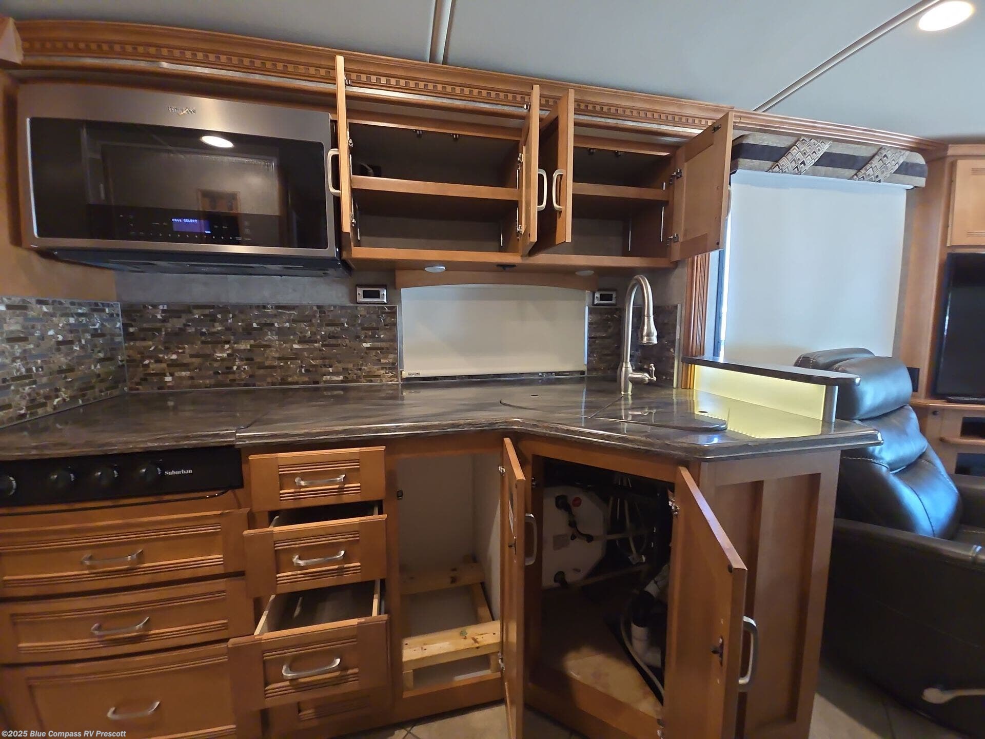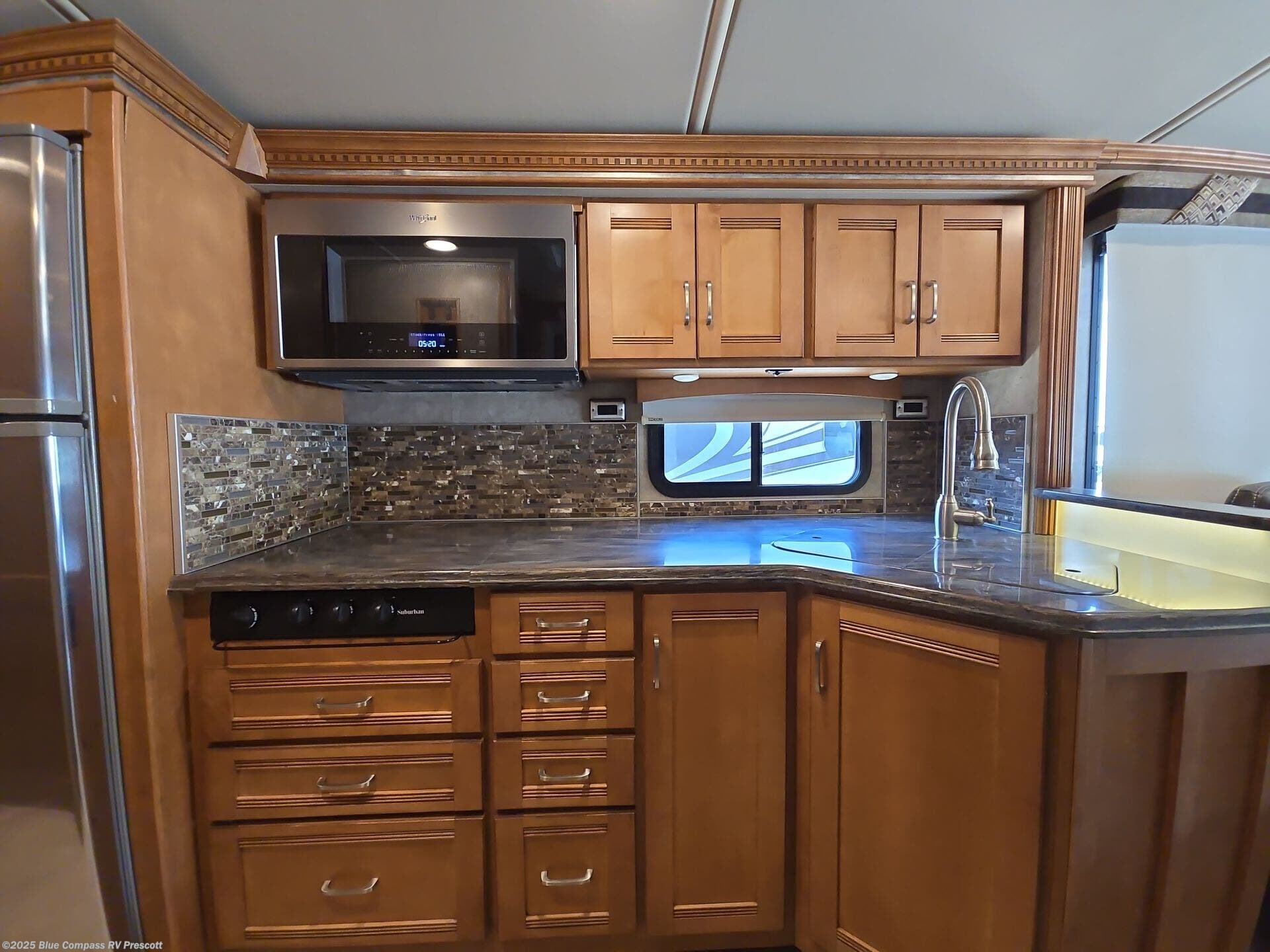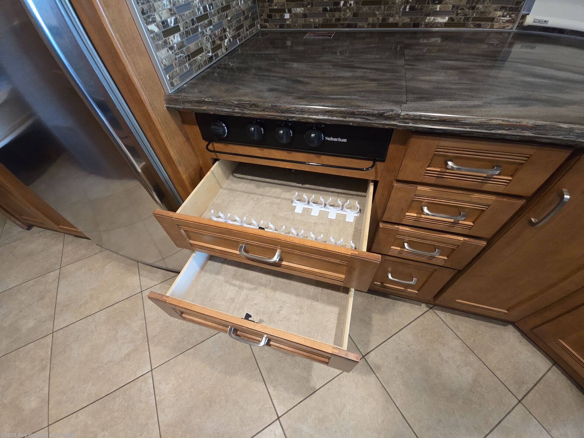 Heading further back you will come to the kitchen and bath area. The kitchen begins at the head of the driver's side slide out with an angled double sink, a three burner range, a residential refrigerator, and storage cabinet that is also the location of the washer and dryer if you wish to add that convenience. Here you will have no problem creating meals and snacks while on the move.