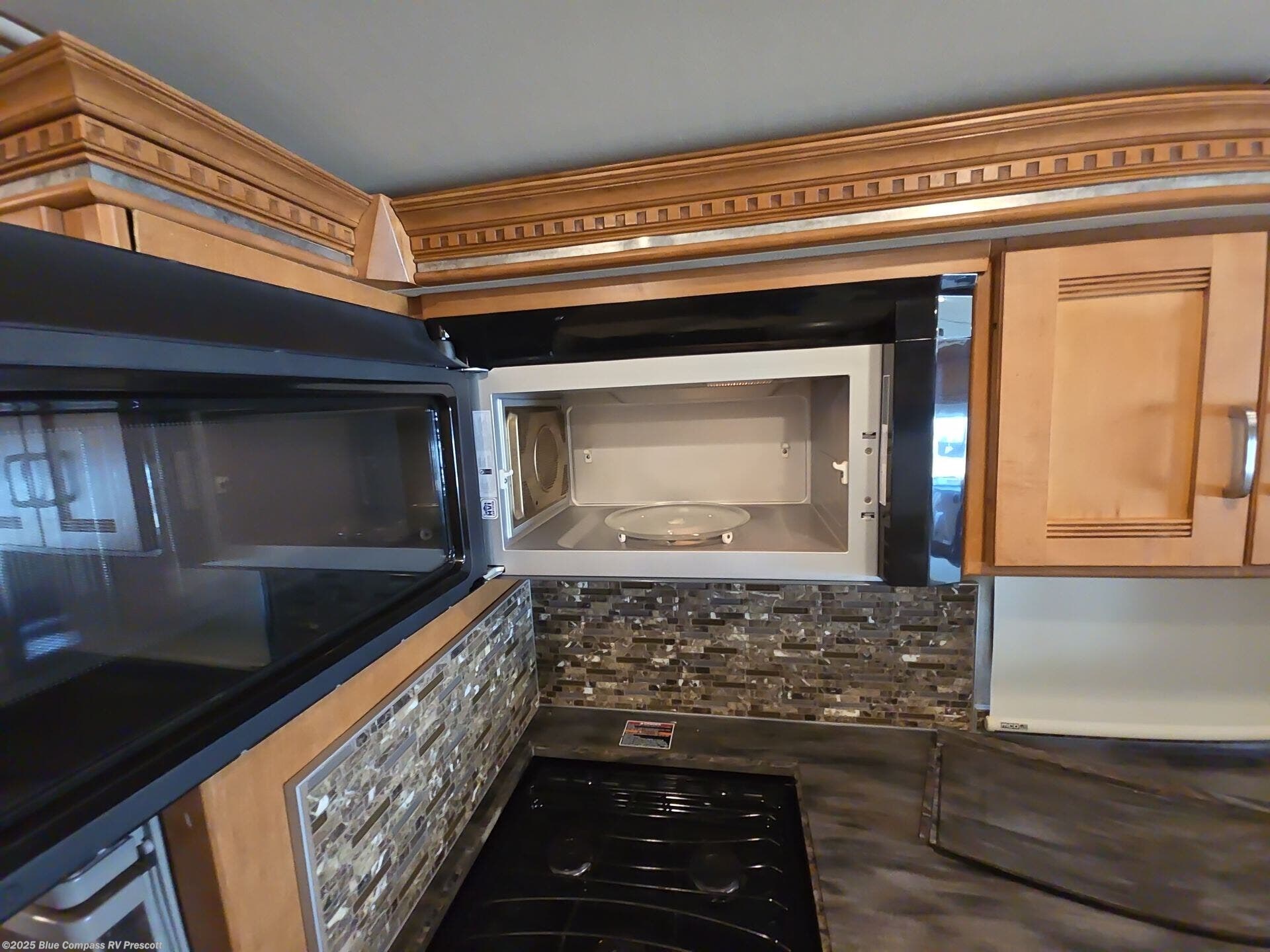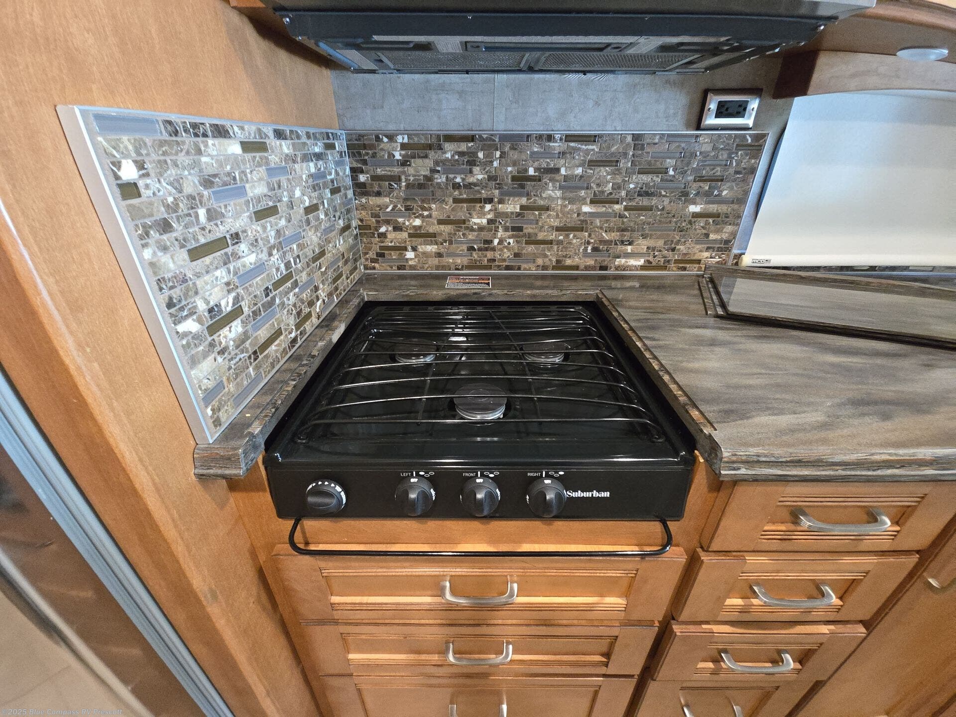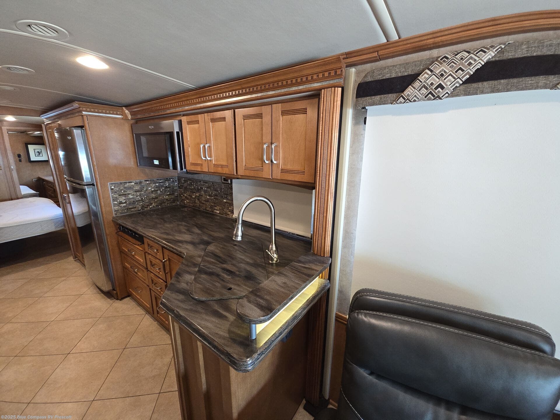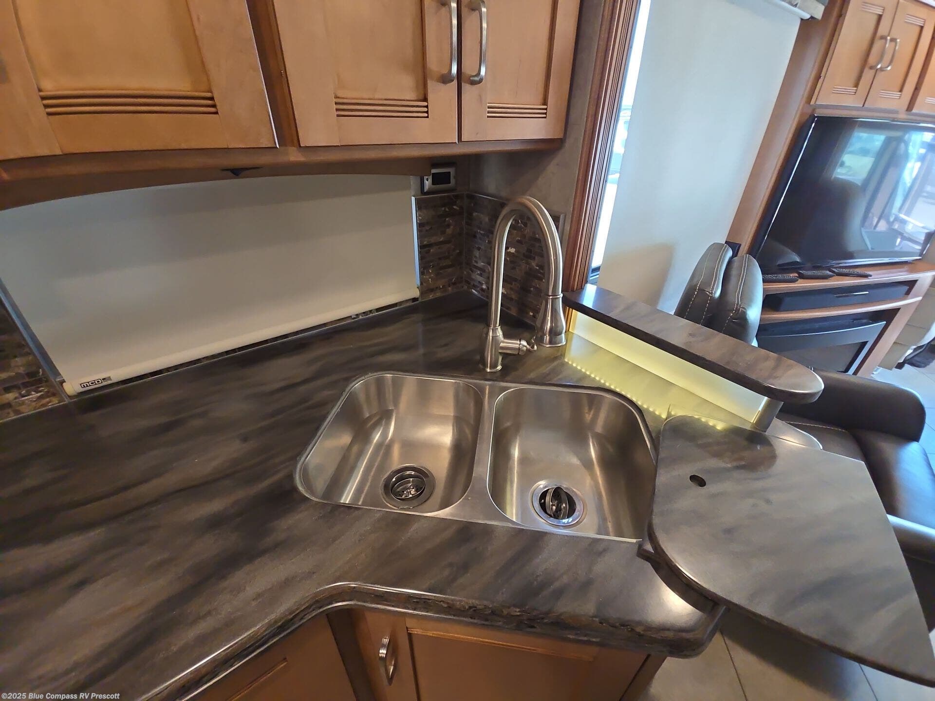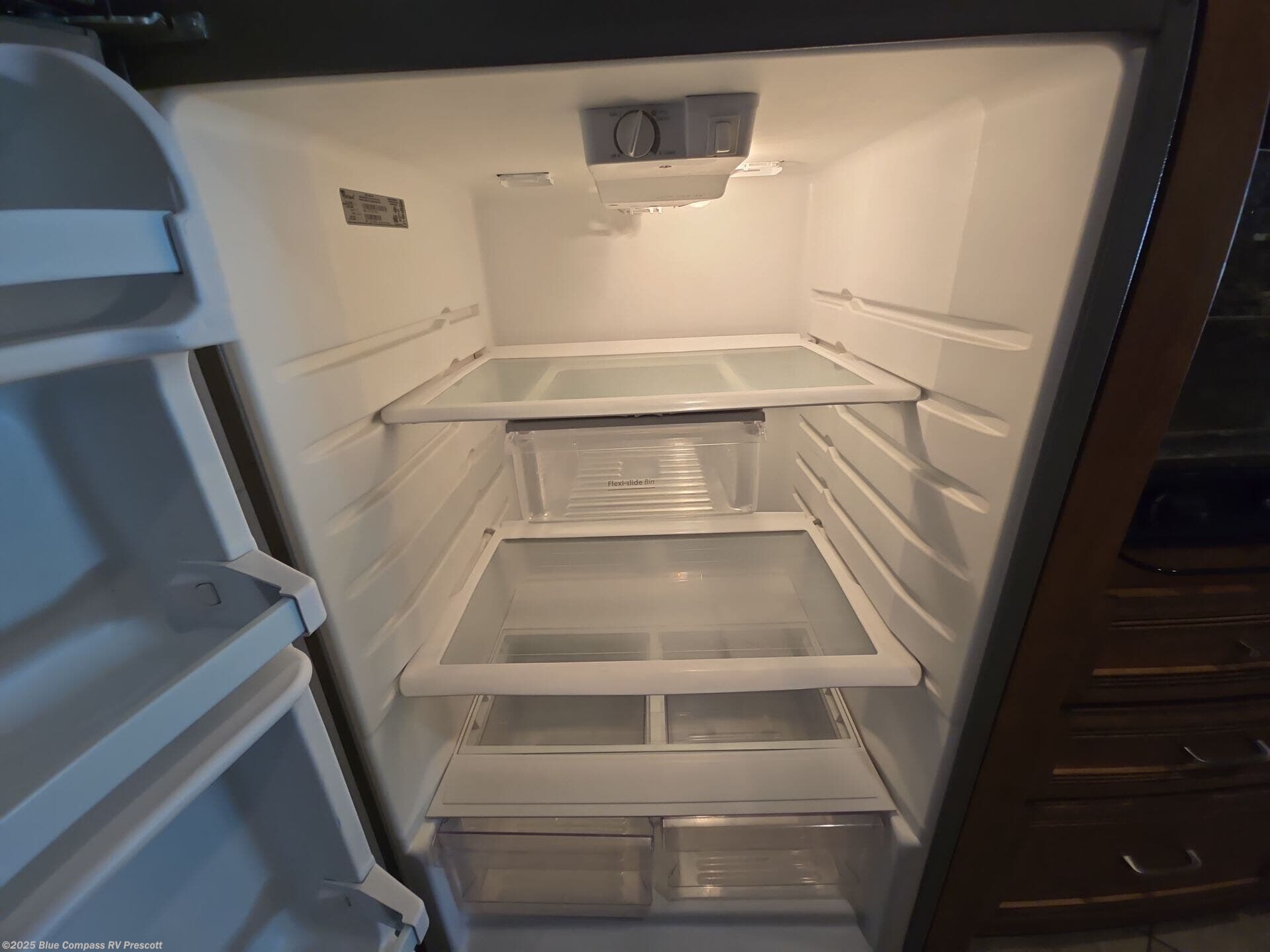 Heading further back you will come to the kitchen and bath area. The kitchen begins at the head of the driver's side slide out with an angled double sink, a three burner range, a residential refrigerator, and storage cabinet that is also the location of the washer and dryer if you wish to add that convenience. Here you will have no problem creating meals and snacks while on the move.
