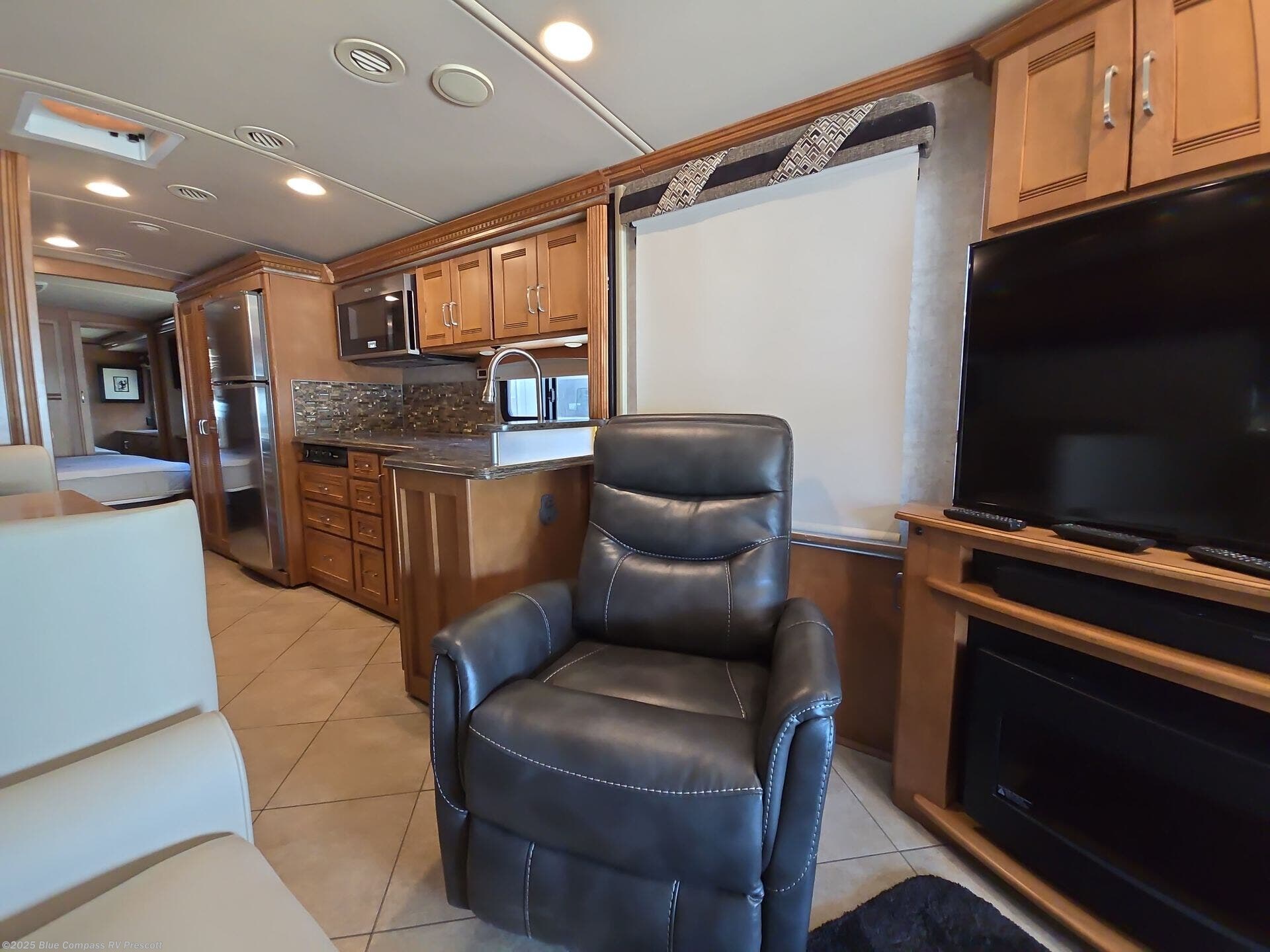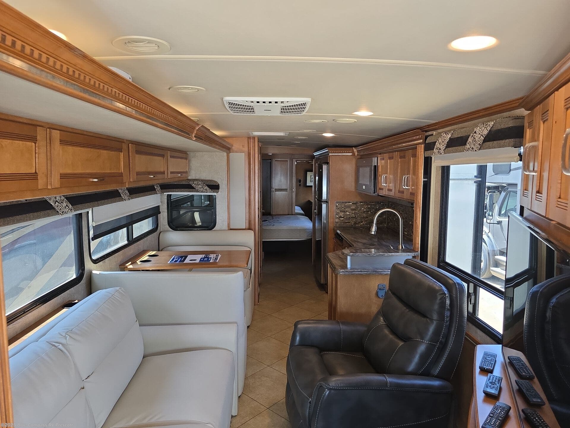 Enter model 36G in front of the passenger seat. Looking back you will see a spacious interior with a slide out Flexsteel fold-n-tumble and Benchmark dinette on your left. Notice the seat belts which are great for rear travelers. Opposite you will find a recliner with pull-out flip-out table, and a corner location for the HDTV, and optional fireplace if you choose to add.