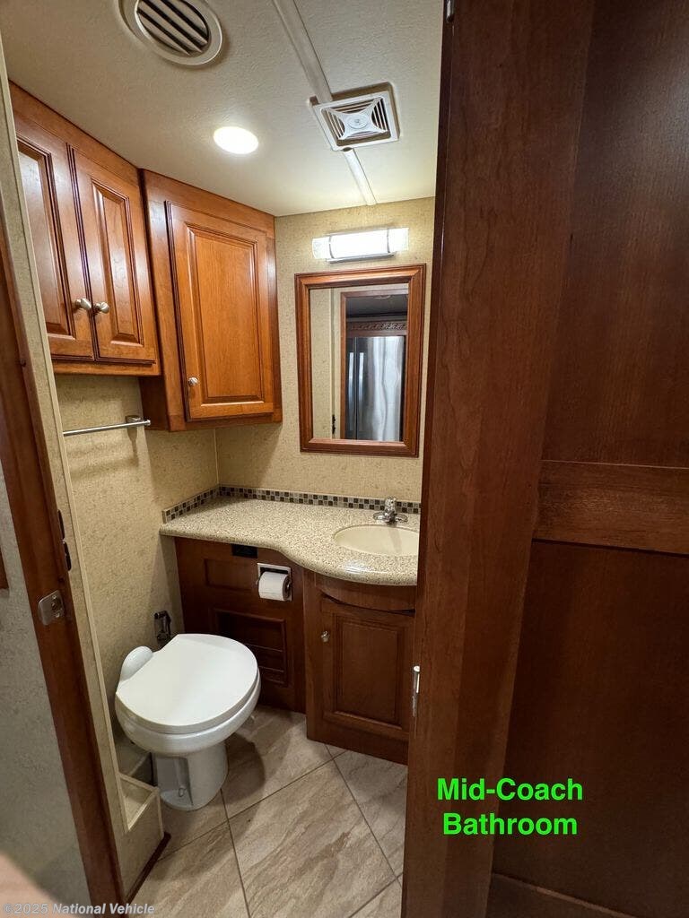 Half bath (mid-coach): Vanity with sink and large mirror Toilet and storage cabinets