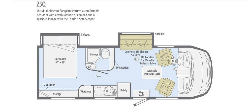 It has a very well-thought-out floor plan with plenty of well-sealed outside storage. The onboard holding tanks and generator ensure easy road trips in superb comfort.