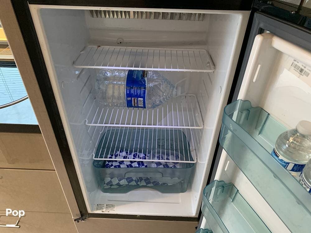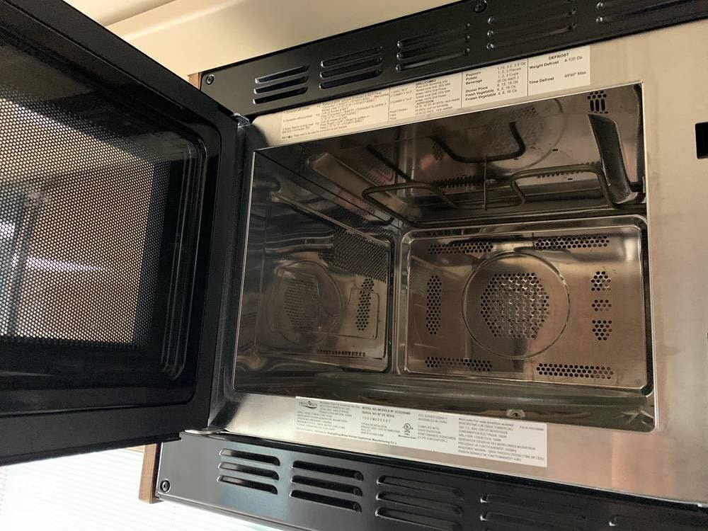 This RV is equipped with a fully equipped kitchen, featuring a refrigerator, microwave, and a three-burner stove.
