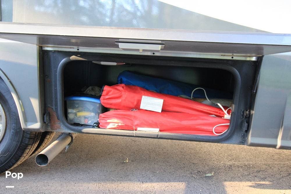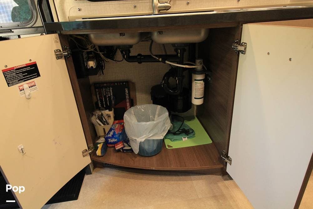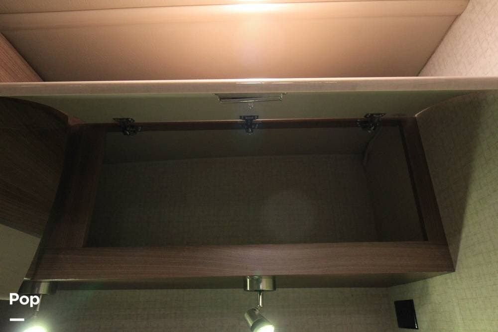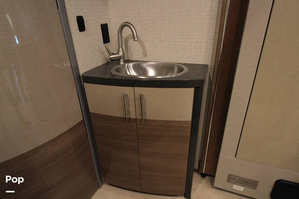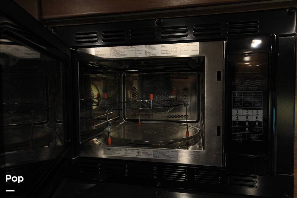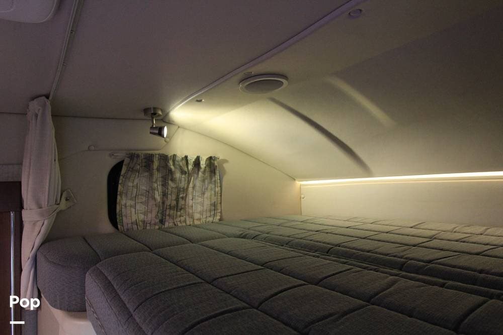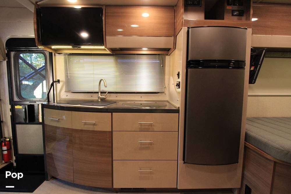 There is a full galley on the entry side of the coach and a wet bath towards the rear adjacent to the camper queen bed. There is an overhead bunk for guests as well.