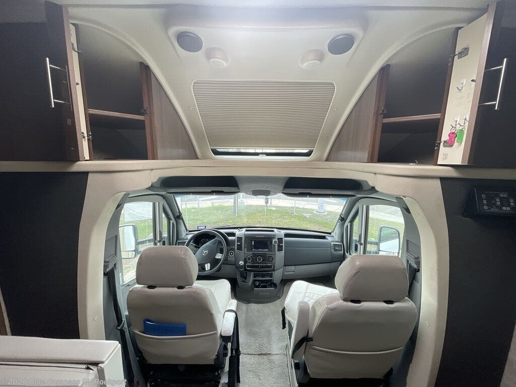 Step inside just behind the front passenger seat. Notice how both driver and passenger seat can swivel around creating additional seating space once parked. There is overhead storage on both sides of the cab area, or you can opt. for a cabover bunk that is 49" x 75", which easily makes room for one additional guest to sleep.