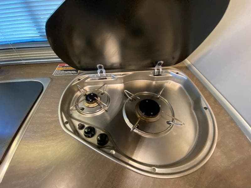 The kitchen area is to the left of the entry door and features a double sink, a two burner cook-top, and refrigerator. You will find a 28" HDTV mounted above the sink location.