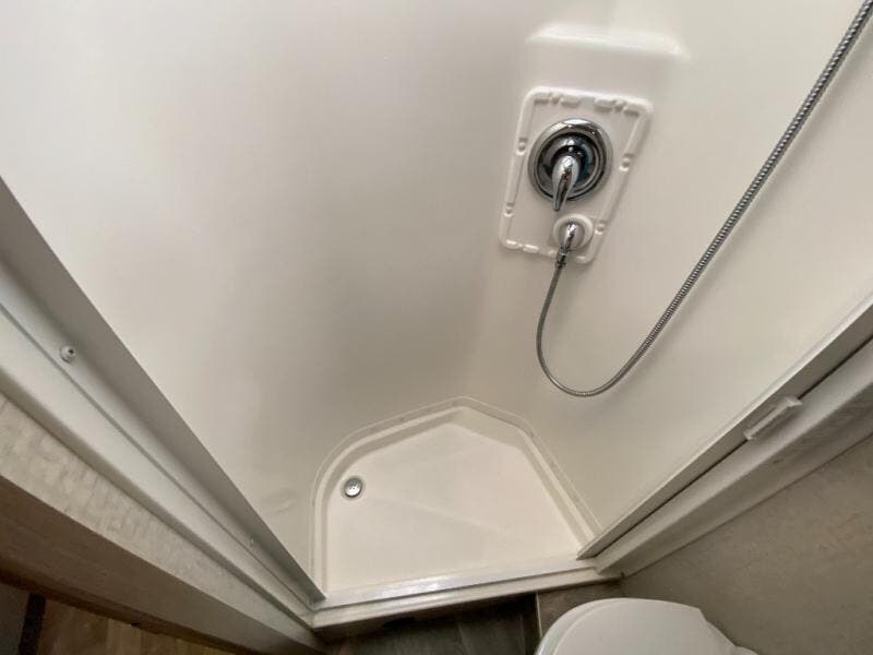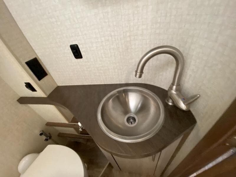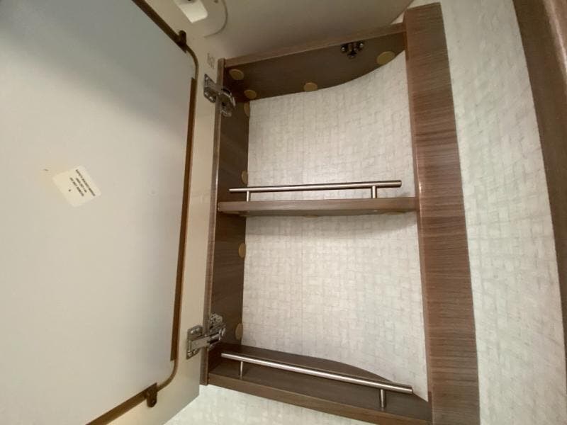 Beyond the sofa heading toward the rear of the coach you will find a side bath with corner shower, toilet, and vanity with round sink including a medicine cabinet overhead. A nice size wardrobe is found across from the bath before the rear bedroom area along the curb side wall.