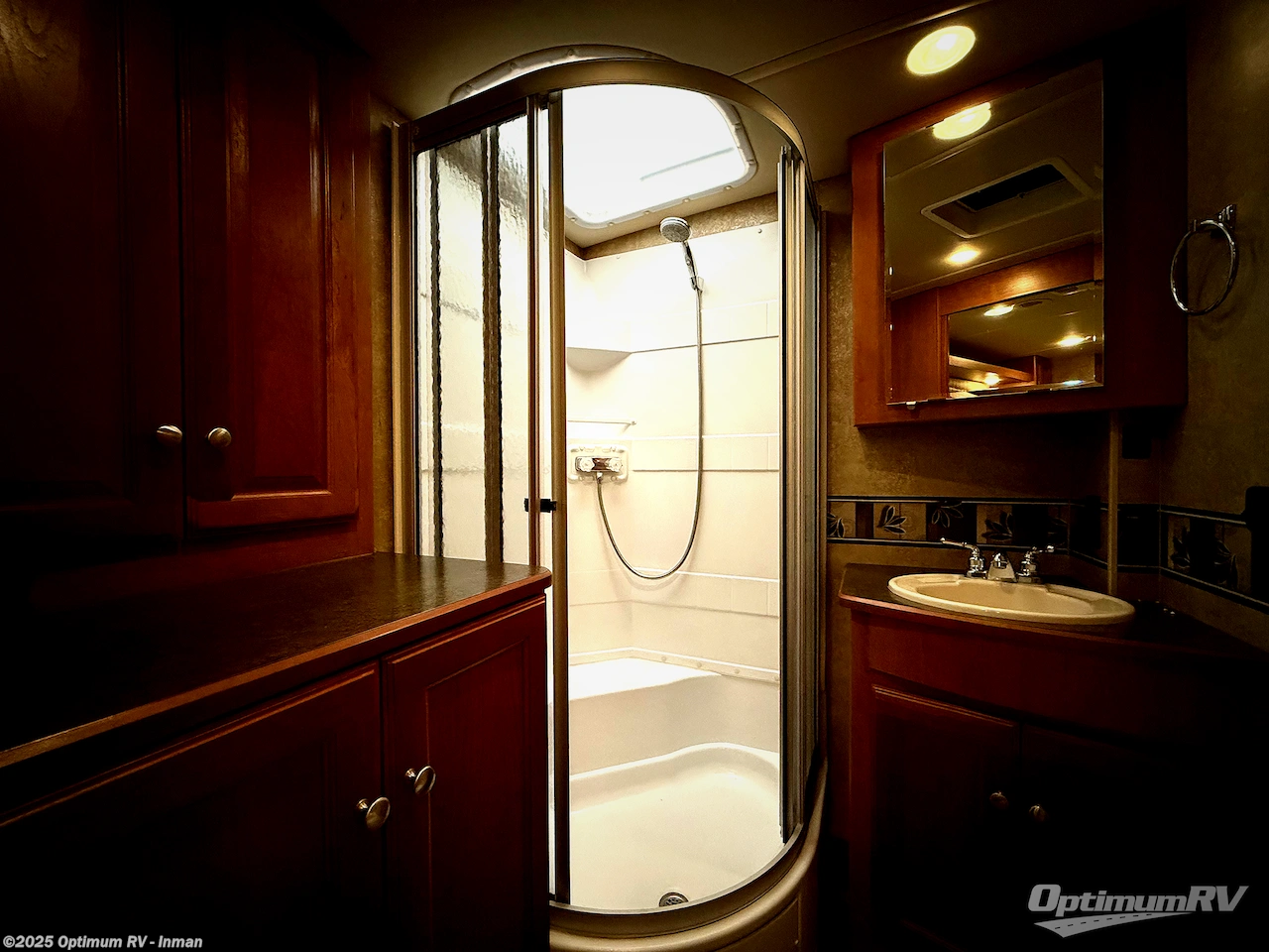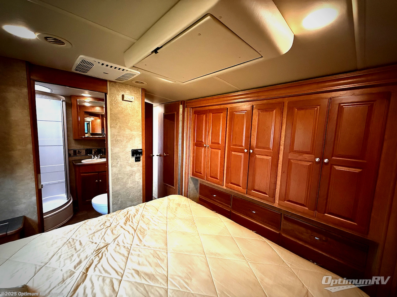 In the bedroom find a slide out wardrobe to your left as you enter. There is a comfortable queen bed for sleeping including nightstands and shirt closets on either side along with overhead cabinetry for more storage. There is a ceiling location for a flip-down 28"HDTV toward the foot of the bed.