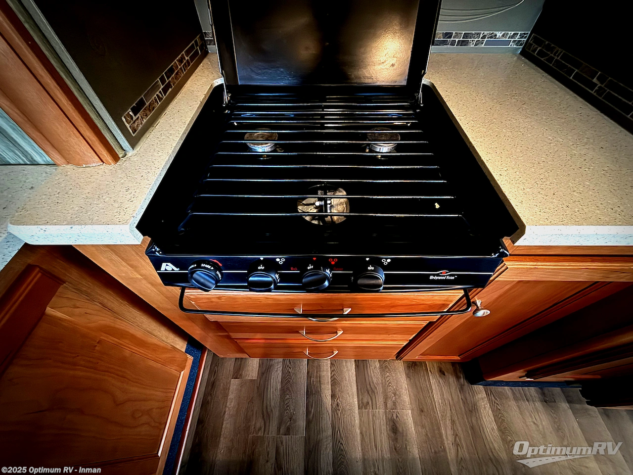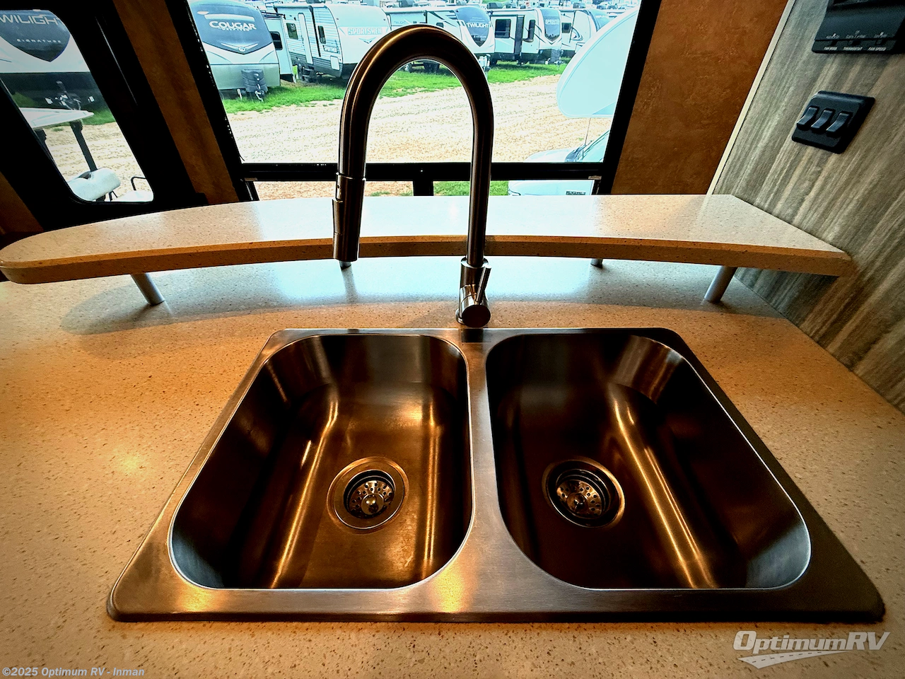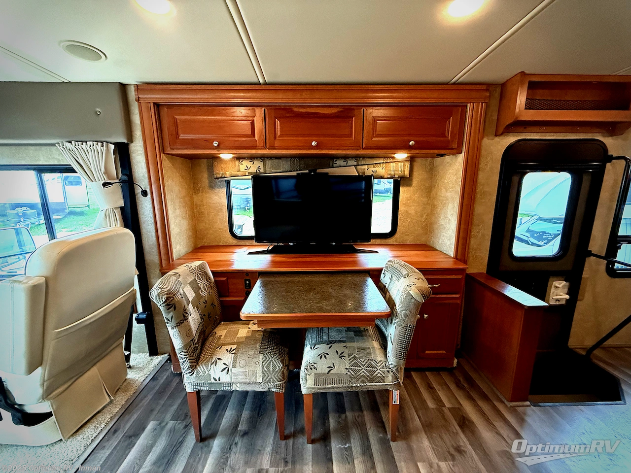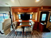 Enter and notice how spacious the combined kitchen and living area is with the dual opposing slides fully expanded. To the right of the entrance is a dining table and chairs with slide out buffet which includes a retractable 40" HDTV. The dining table expands to easily accommodate you and your guests.