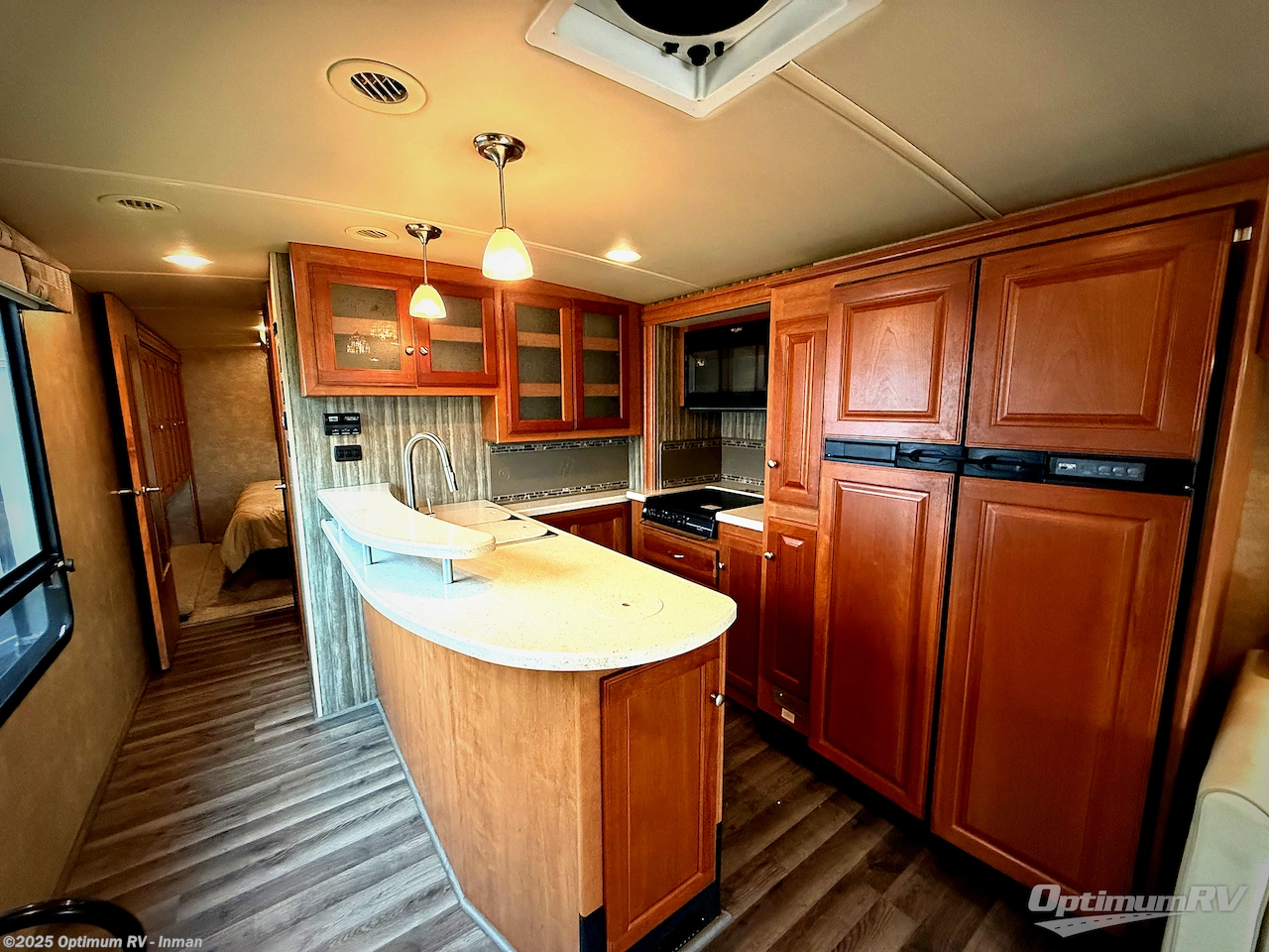 If you find you need a bit more space for sleeping you can choose to add the optional studio loft powered bed above the cab area that is 32" x 89". You can also choose an optional king size bed in place of the queen in the rear master, and a four door refrigerator, plus so much more!