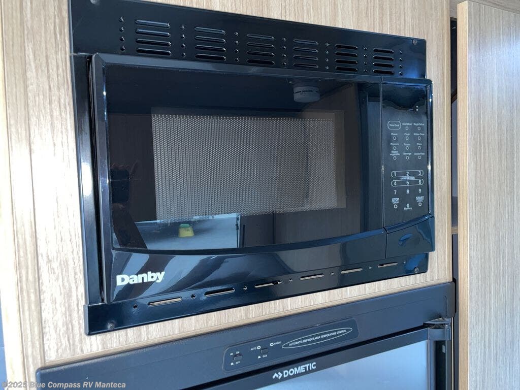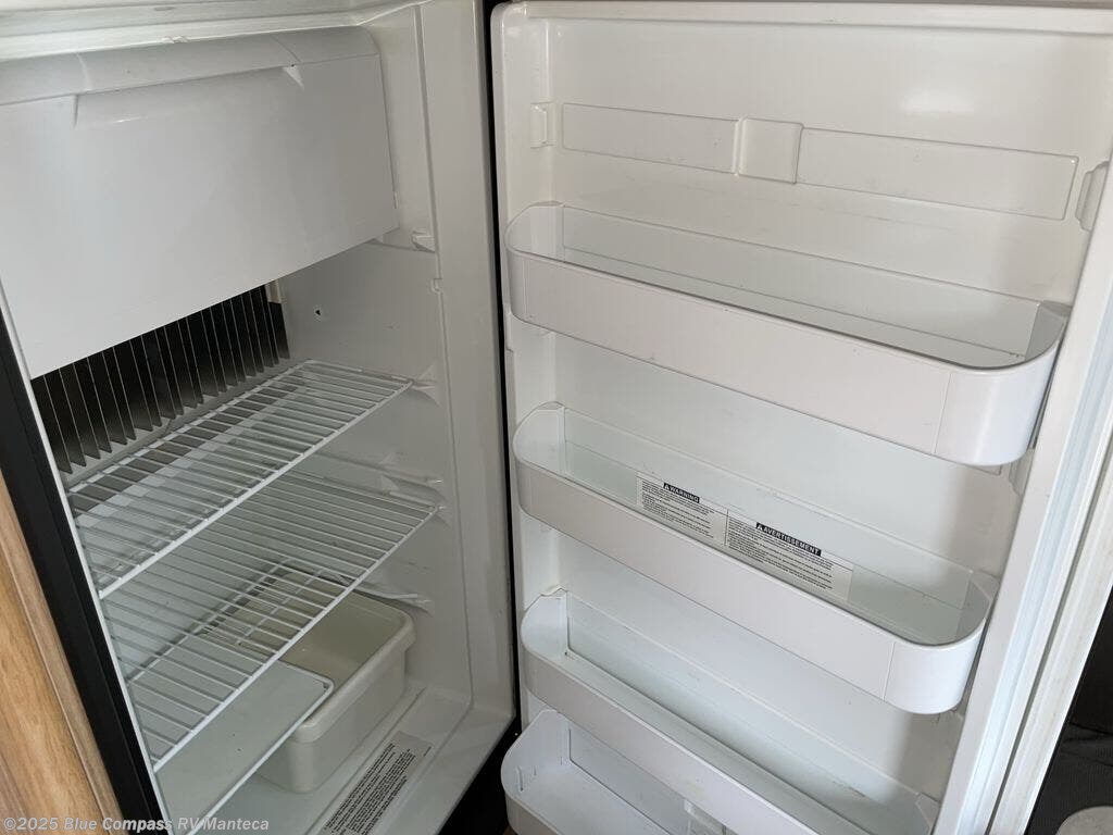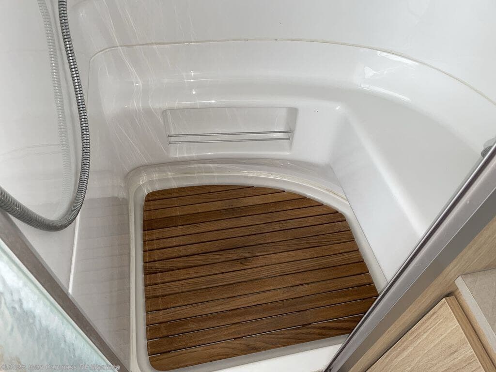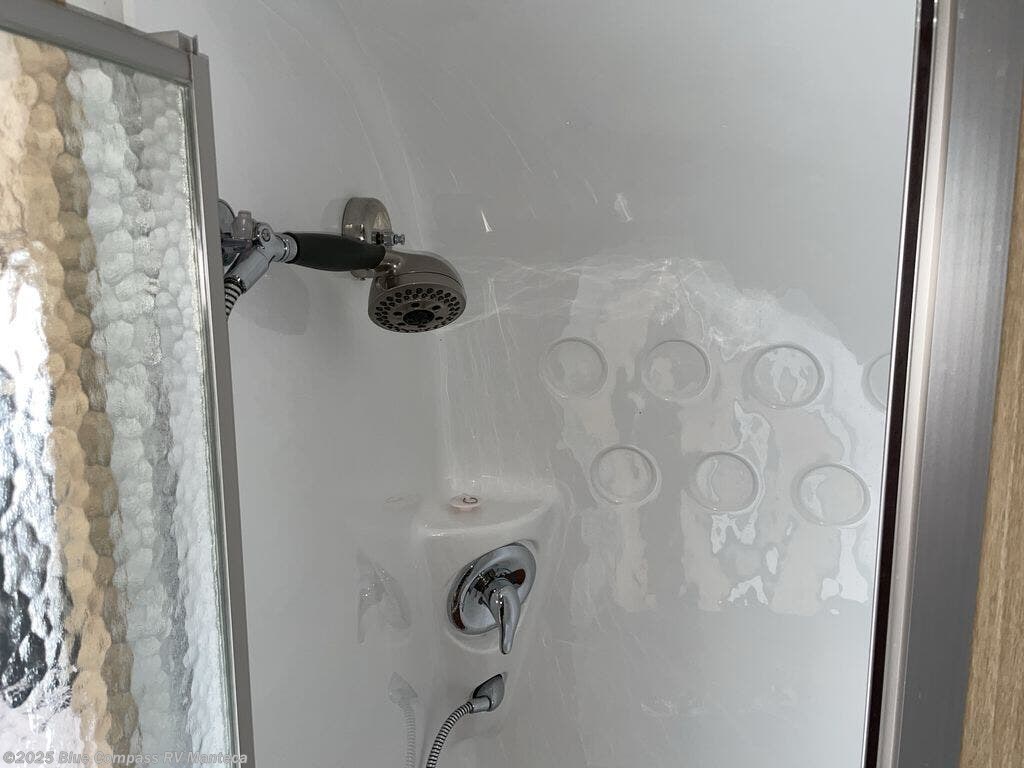 As you enter the travel trailer, the bathroom is in the rear. You will find a shower, sink, and toilet.