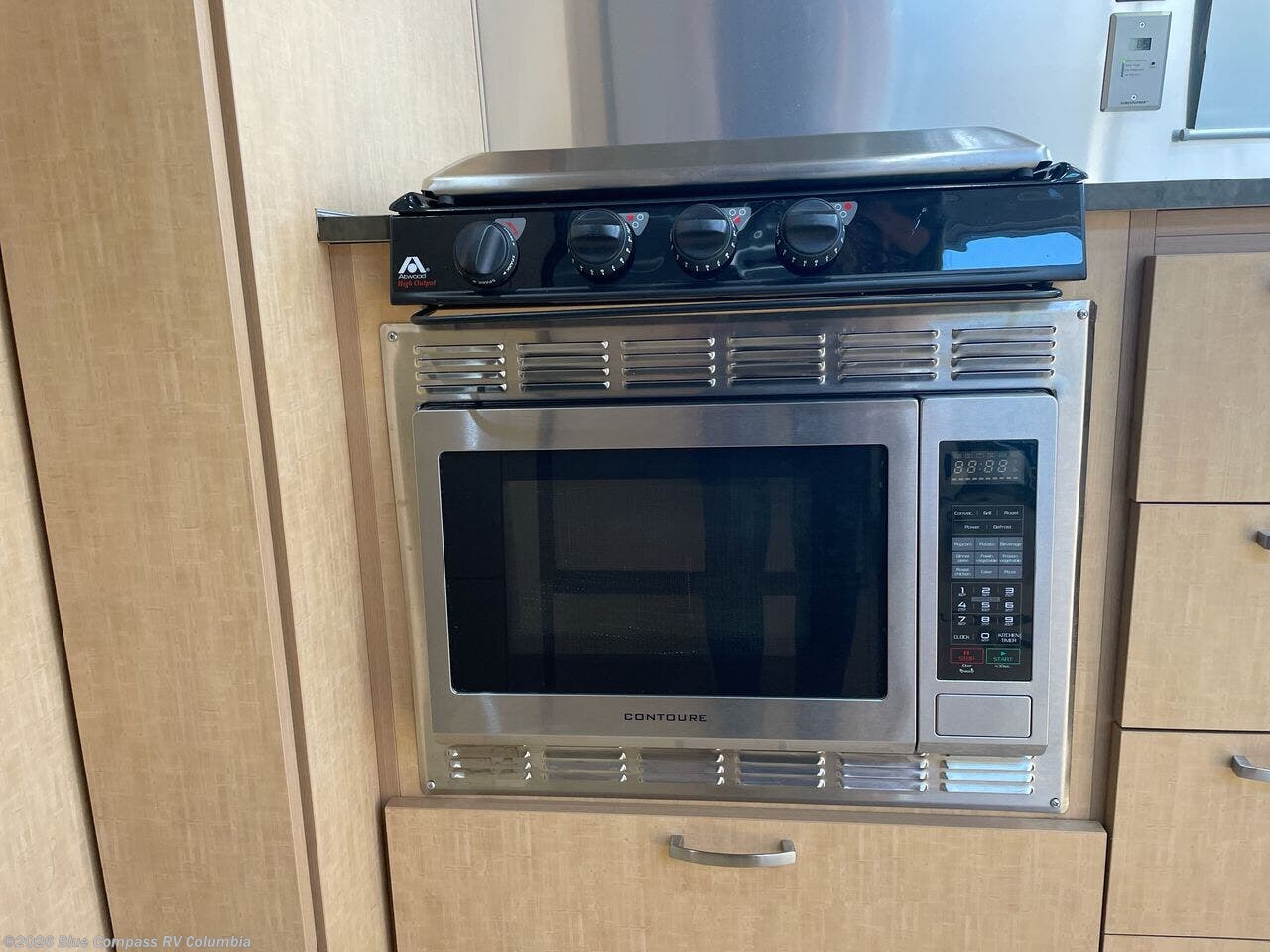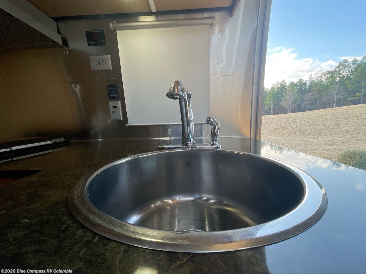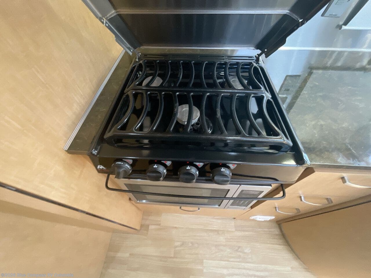 The galley has a sink, a three burner range, and pantry on one side of the travel trailer. On the opposite side you will find a refrigerator.