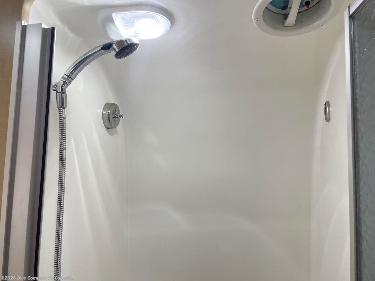 In the bathroom along the curb side wall there is a private toilet area with a sink. Opposite you will find a shower. The wardrobe next to the shower provides additional storage space for clothing and things.