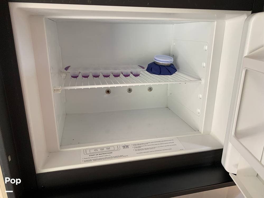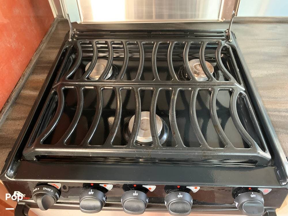 The galley is equipped with a round galley sink, a three-burner range, and a 7 cu. ft. two-door refrigerator, and an oven.