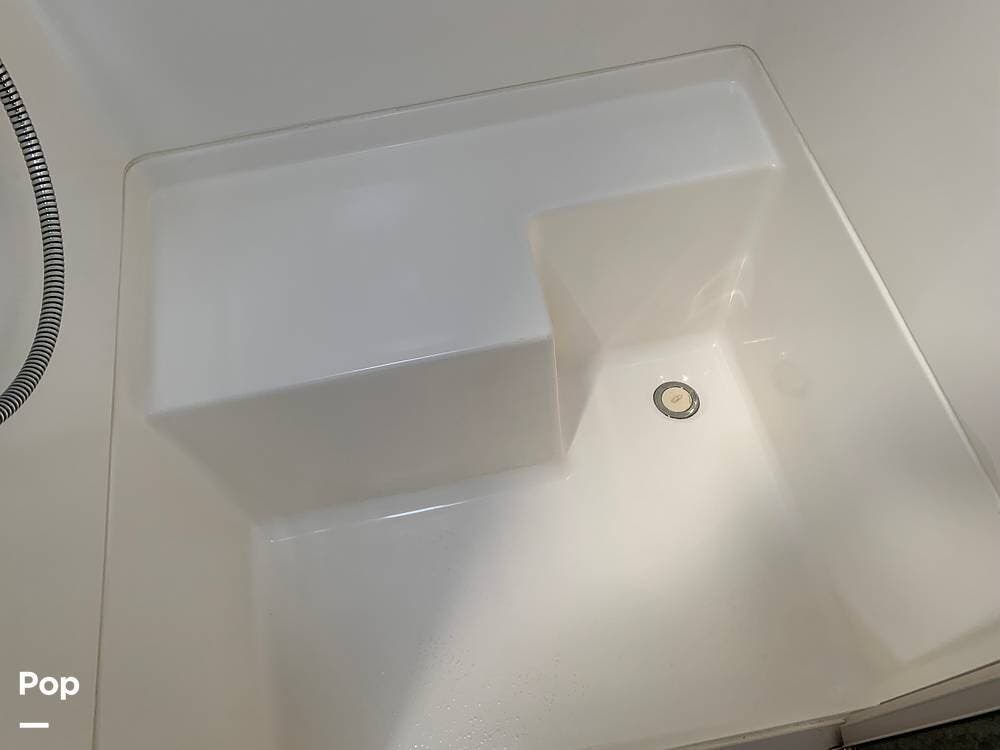 It has a split bath with a shower on one side and a private toilet area with a sink on the other.