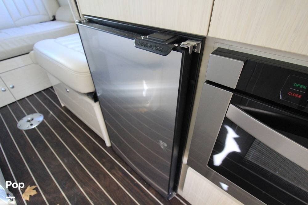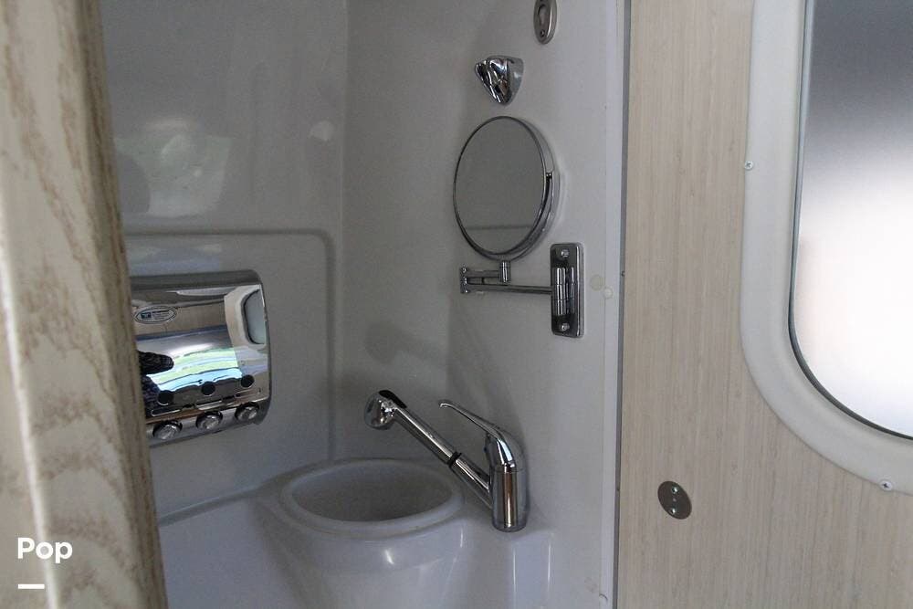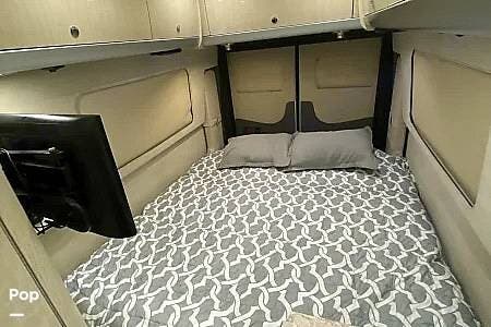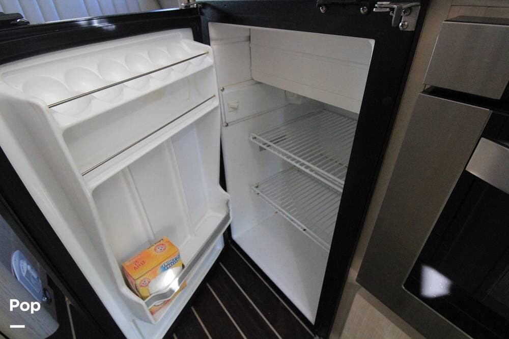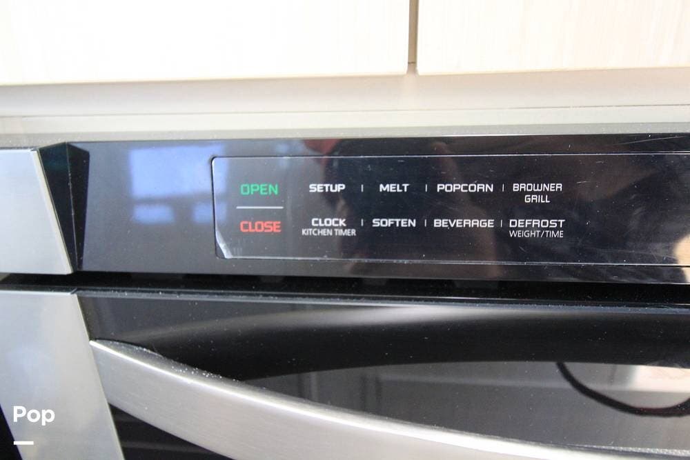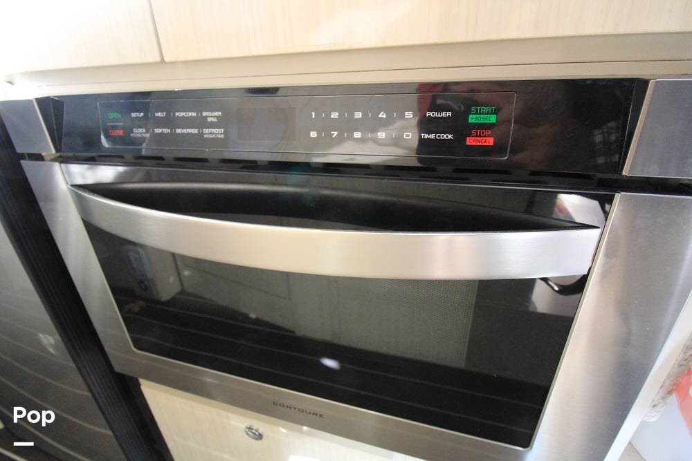 There is a full wet bath on the passenger side opposite the galley, featuring a mini fridge and a convection microwave.