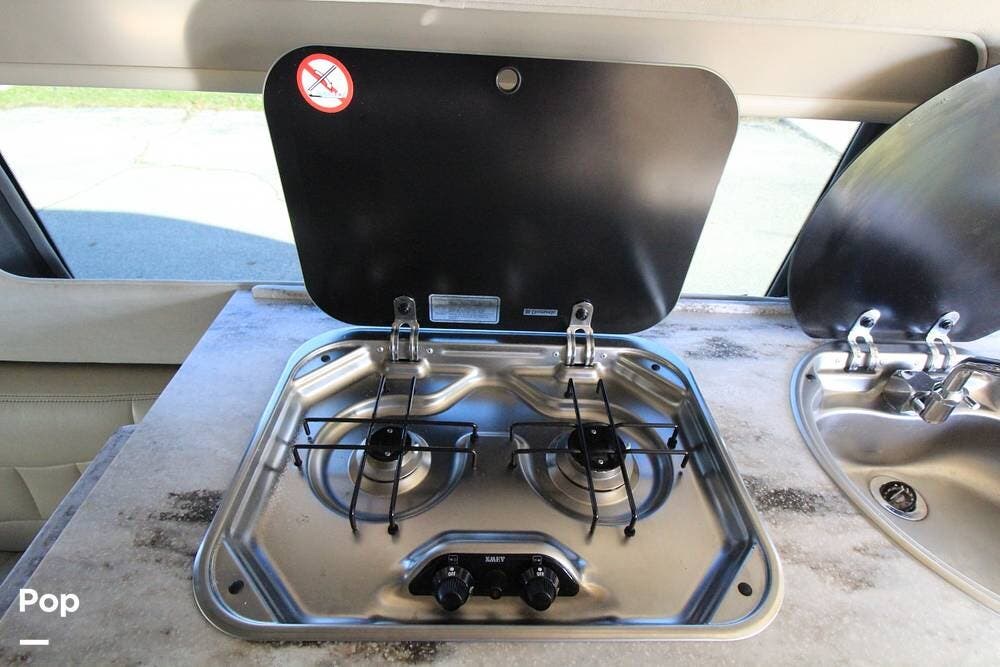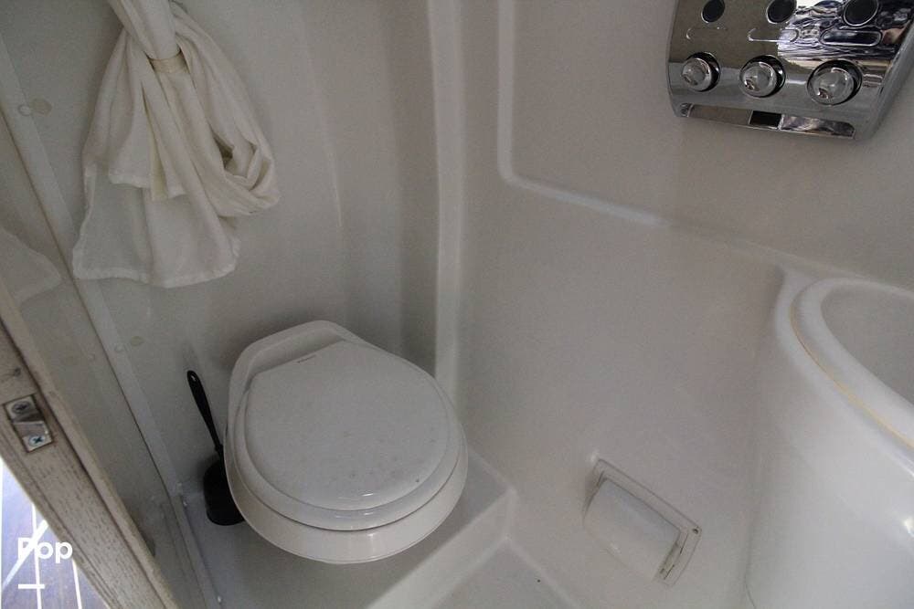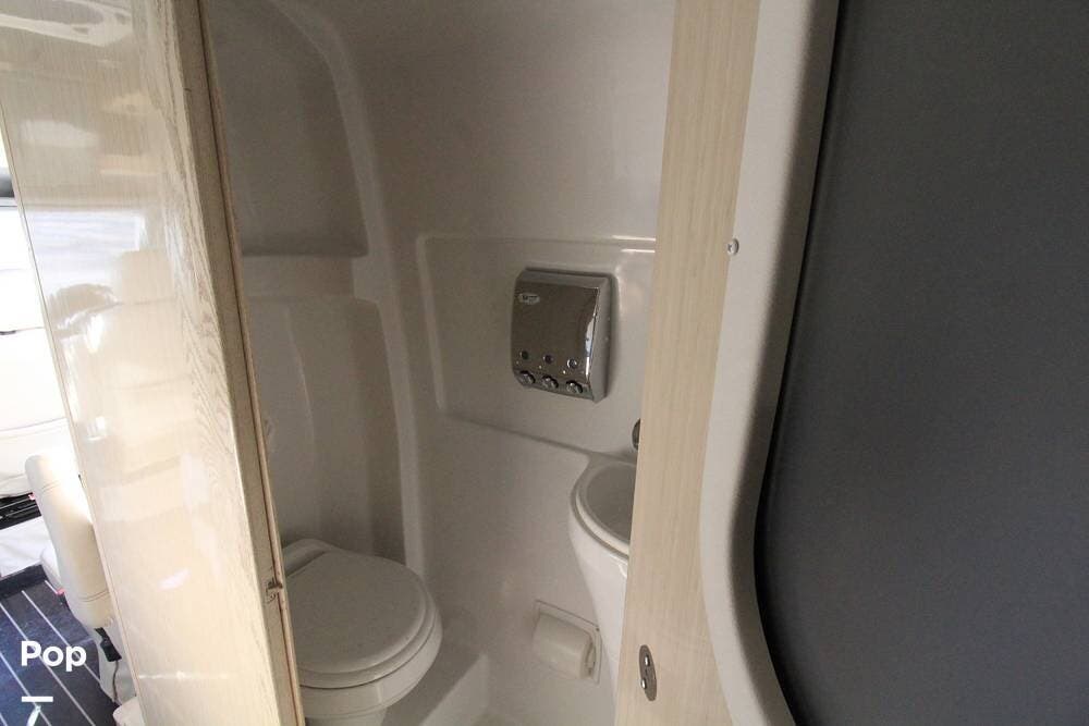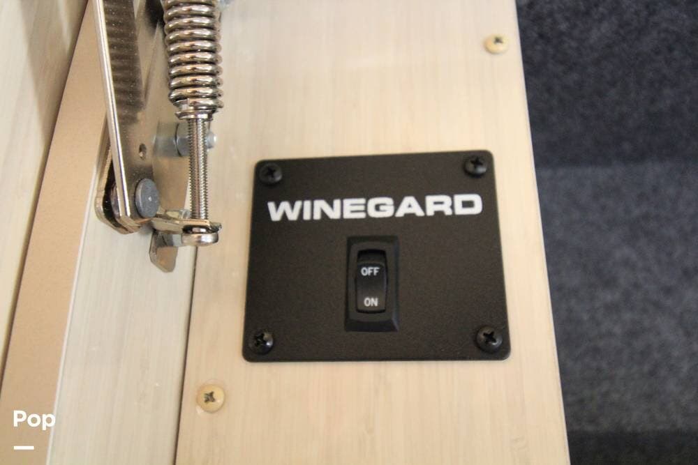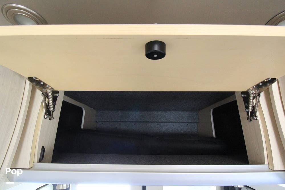 There is a full wet bath on the passenger side opposite the galley, featuring a mini fridge and a convection microwave.
