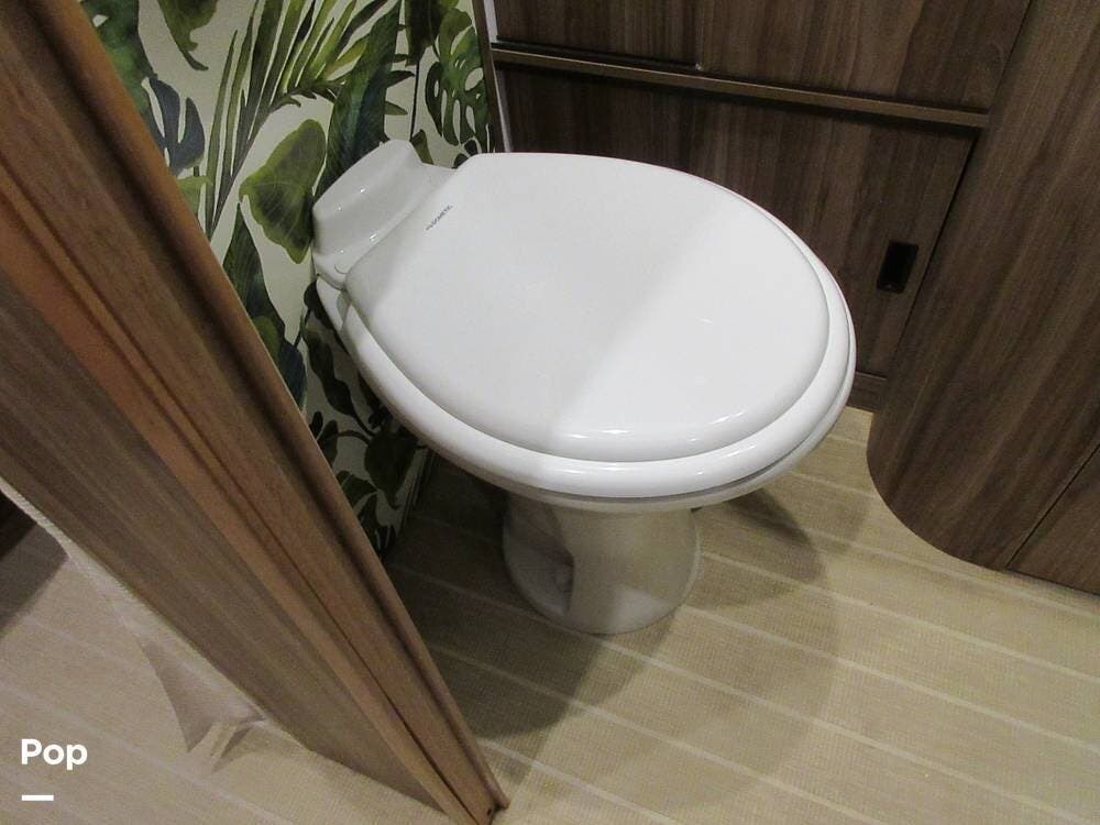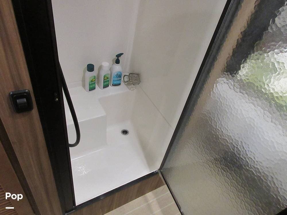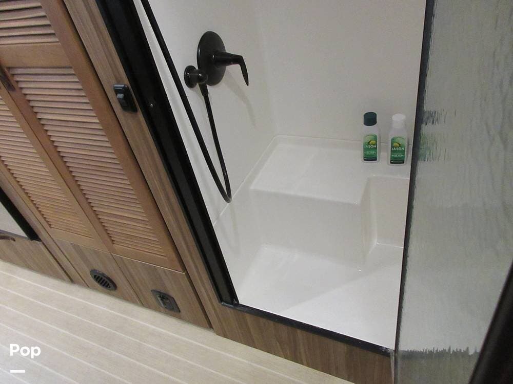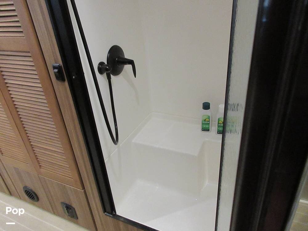 This RV features 30-AMP power and sets up nicely in any RV Park. But what if you wander off the grid? No problem. This model has you covered with two house batteries, a 39-gallon fresh water tank, a 37-gallon gray water tank, a 39-gallon black water tank, and two 30-pound propane tanks. Additionally, this unit features two solar panels on the roof to keep your house batteries charged, wherever you go.