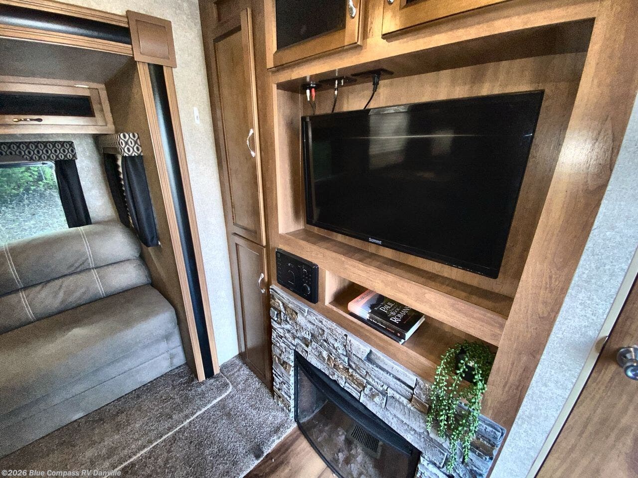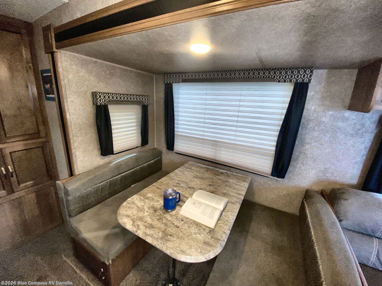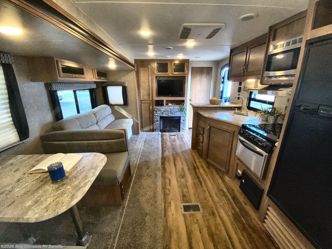As you move into the main living area of this unit you will see a spacious retreat filled with everything you need while traveling away from home. The single slide out featuring a booth dinette and sofa provides plenty of space for dining and just hanging out. There is a pantry and an entertainment center located nearby along the interior living room wall that can easily be seen from any of the seating. It also includes a cozy fireplace below.