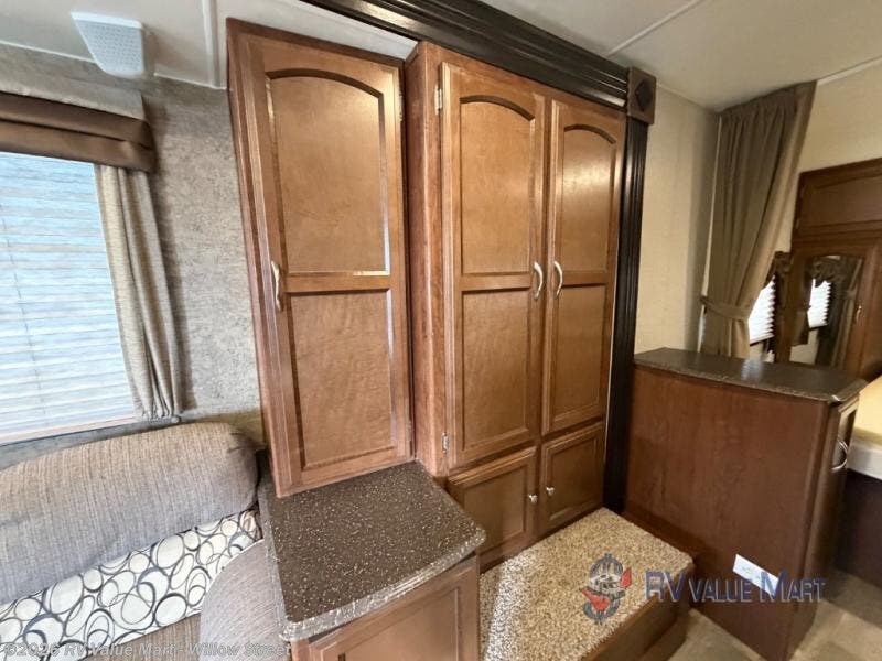 In the front you will see a 60" x 80" queen bed with wardrobes, plus it also features a full overhead storage cabinet too.