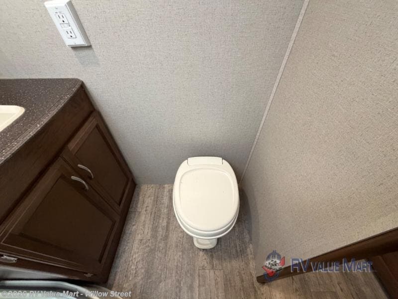 The convenient full bath is located beyond the dinette along the curb side, and features a corner shower, a toilet, and a sink.