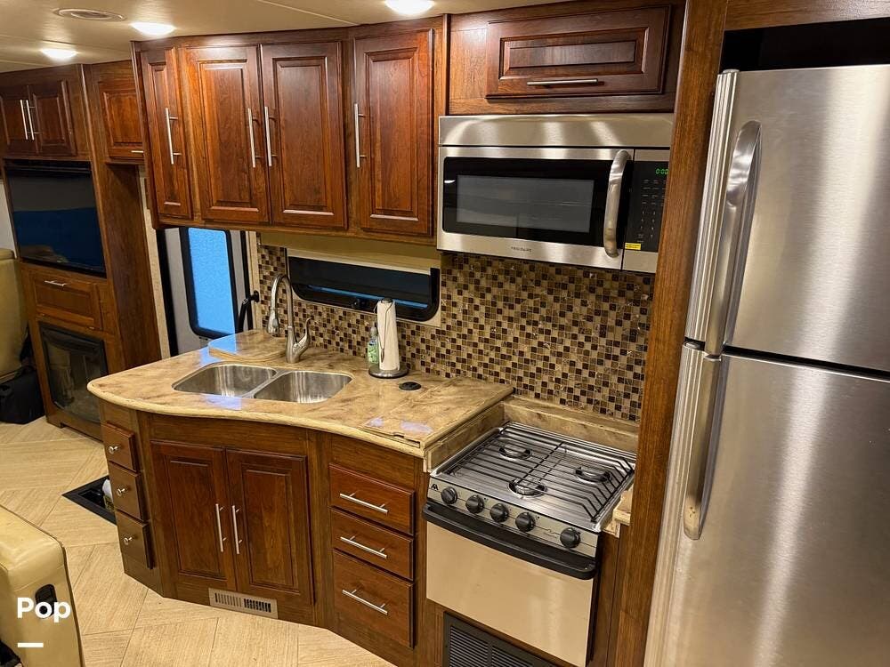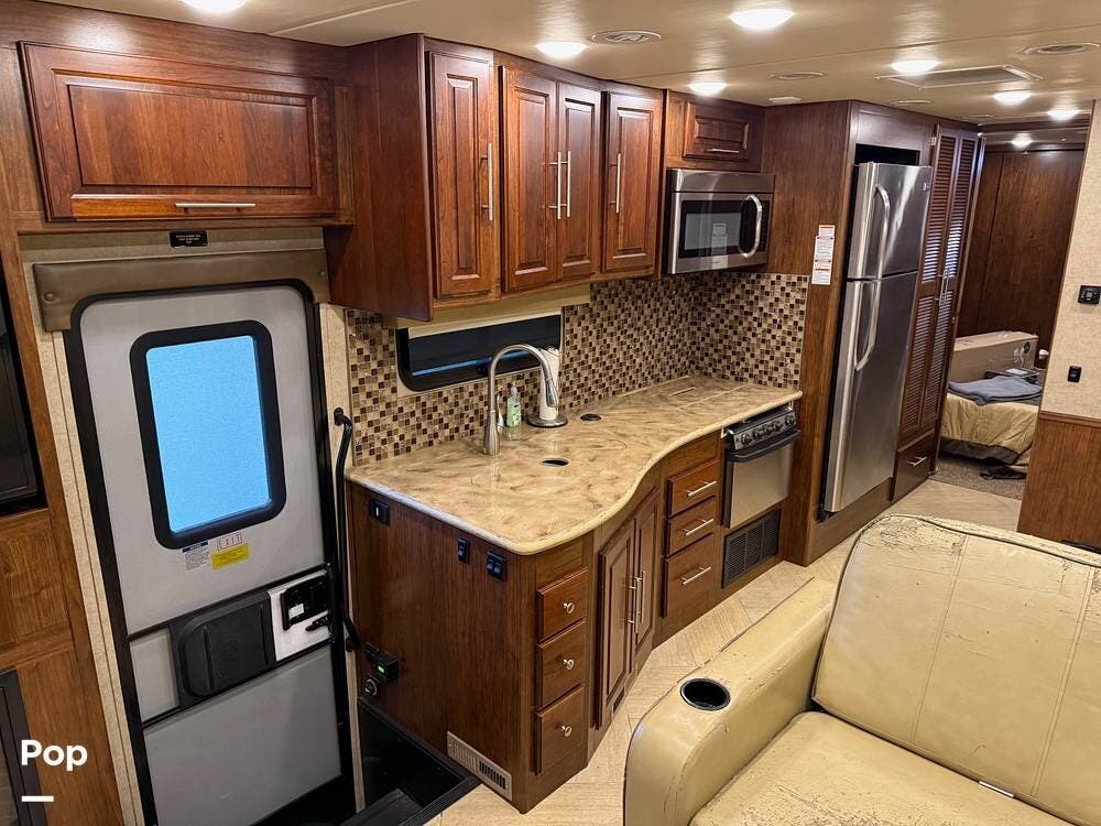 Mid-coach entry opens into a welcoming living area featuring a large sofa, TV, roomy dinette, and plenty of overhead storage. The angled kitchen adds counter space, a deep sink, a microwave, a stovetop, and a residential refrigerator, making it perfect for easy meal prep on the go.