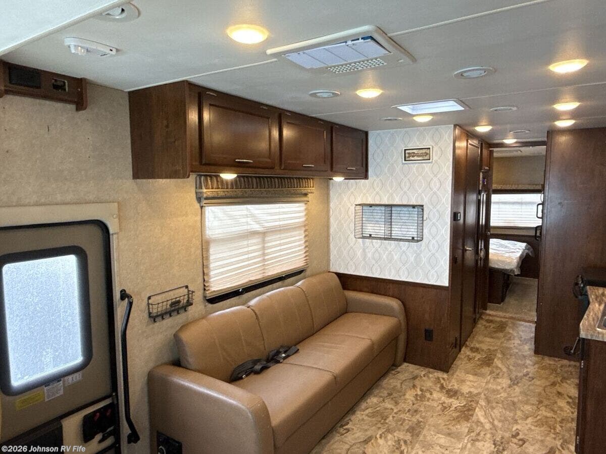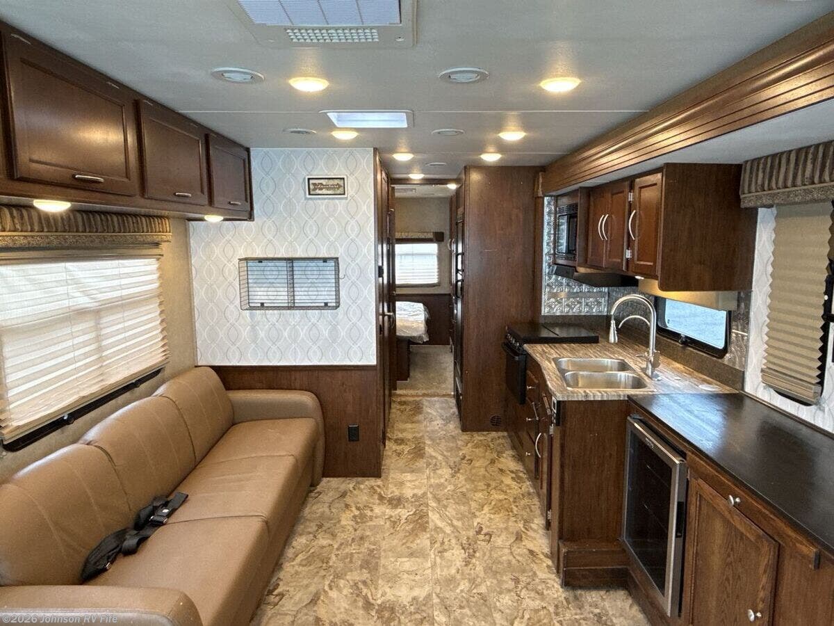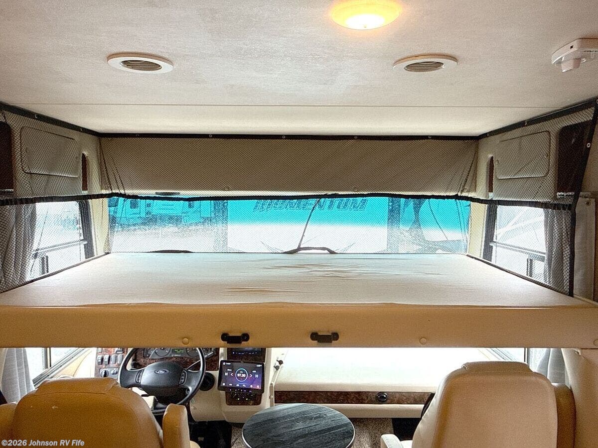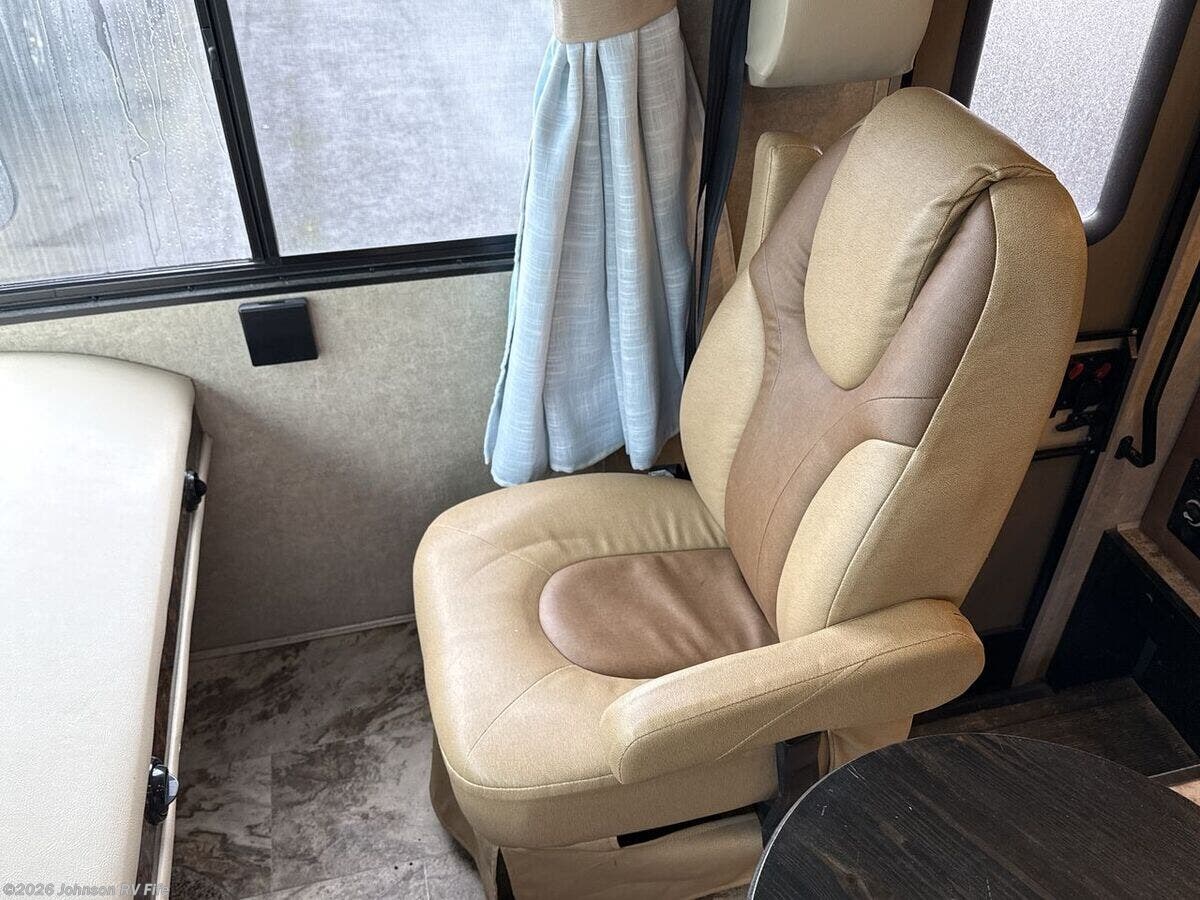 The 2017 Coachmen Pursuit 31SB is a used Class A RV meticulously designed for adventure seekers and travel enthusiasts. With its sturdy Ford F-Series Super Duty chassis and powered by a robust Triton 6.8L V10 gas engine, offering 362 horsepower and 457 lb-ft of torque, this motorhome ensures a smooth and powerful drive. The TorqShift 5-speed automatic transmission enhances driving performance, and the stainless steel wheel liners, along with rear mud flaps, add to the RV's durability. Exterior features include a fiberglass exterior with Azdel composite construction for enhanced durability. The front cap is made of fiberglass, and the crowned laminated TPO roof is designed for longevity. Convenient features like a power patio awning and patio light create a welcoming outdoor space, while the rear-mounted ladder, bumper, and heated holding tank compartment add functionality. It also comes equipped with a 5000-pound hitch and a 7-way plug. Inside, comfort and convenience are prioritized. The cab area has a power drop-down bunk system for additional sleeping space and recline swivel pilot seats for driving ease. Privacy is ensured with cab privacy shades, and entertainment options are available with the AM FM CD dash radio. The living spaces boast a soft-touch jackknife sofa and Congoleum linoleum flooring for easy cleanup and maintenance. Storage options are ample with a pullout pantry, stepwell shoe storage, broom and coat closet, and oversized storage compartments. Mini blinds, a message center cork whiteboard, and a pet-friendly floor line window add thoughtful touches. A fully equipped dining area features a dinette booth, double bowl sink with high-rise sprayer faucet, laminate countertops, and a 3-burner range with a range hood light. The kitchen is completed with a microwave oven and flush mount refrigerator. In sleeping quarters, a comfortable queen-size bed (60x74) is the centerpiece, complemented by residential curtains for privacy and an exhaust fan prewire for ventilation. The bathroom includes an ABS shower surround, upgraded shower curtain, and a porcelain foot flush toilet, further equipped with a power vent for moisture control. Mechanicals include a robust 4.0 Onan generator, a single coach battery, a 20-gallon LP tank, and a 55-amp converter. The 15k AC roof ducted system and 30k electronic ignition furnace ensure comfort in various climates. A 6-gallon DSI hot water tank provides heated water efficiently. Altogether, this RV offers a perfect blend of luxury and practicality, making it an excellent choice for memorable road adventures and camping experiences. ???