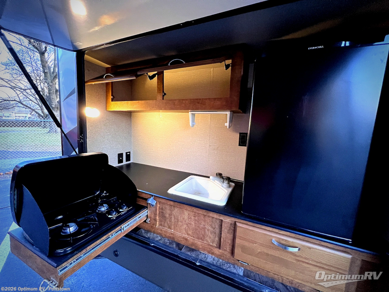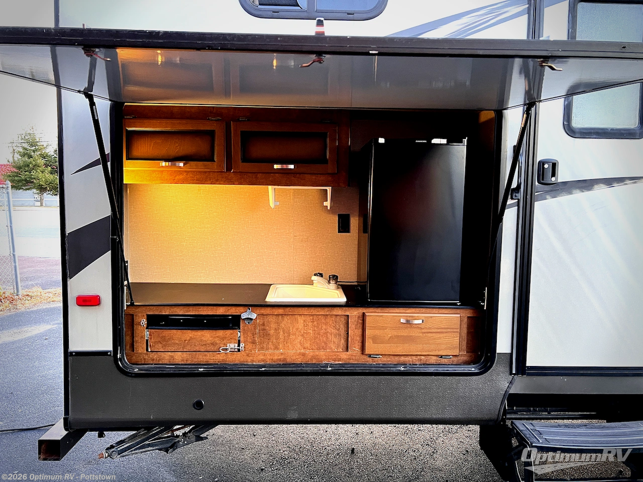 Outside there is an exterior kitchen with a refrigerator, and sink. You can even choose an optional bumper mount grill, plus more!