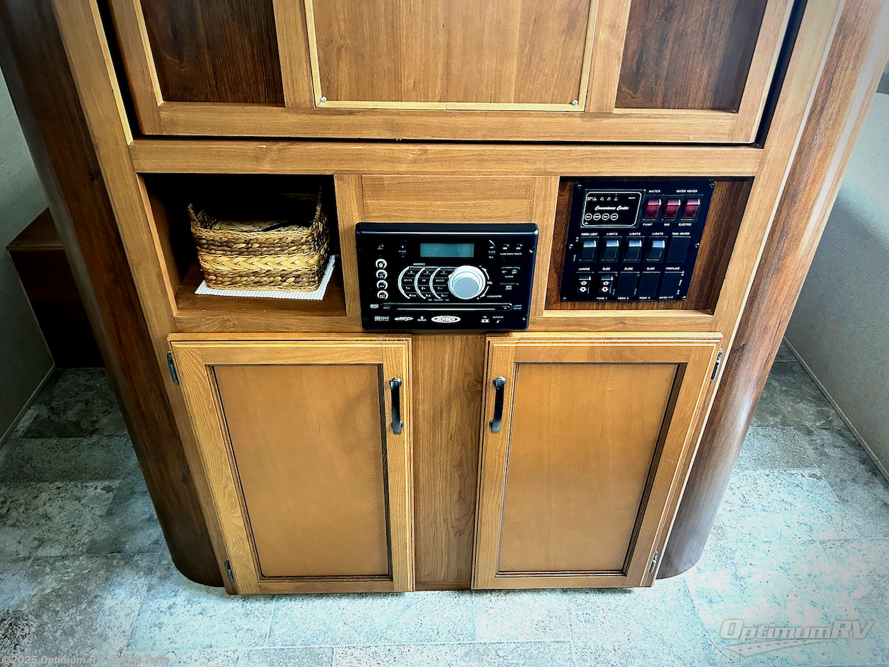 The main living area has a nice size entertainment center along the interior wall for your enjoyment. There is a slide with a dinette and sofa along the road side. The opposite side has an angled contertop with a double kitchen sink, overhead storage, three burner range, microwave, refrigerator, and a wardrobe/pantry.