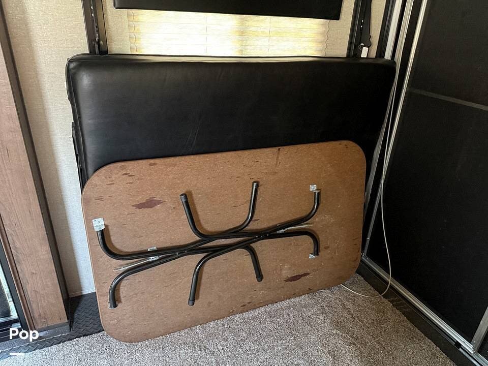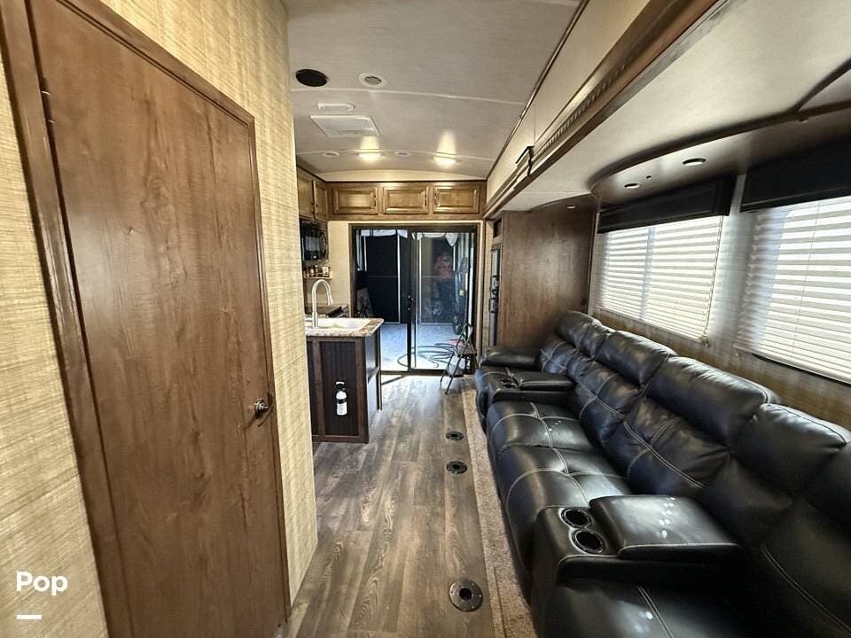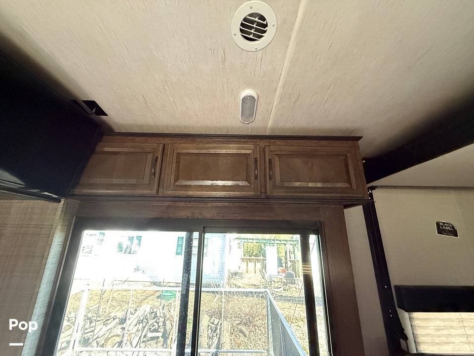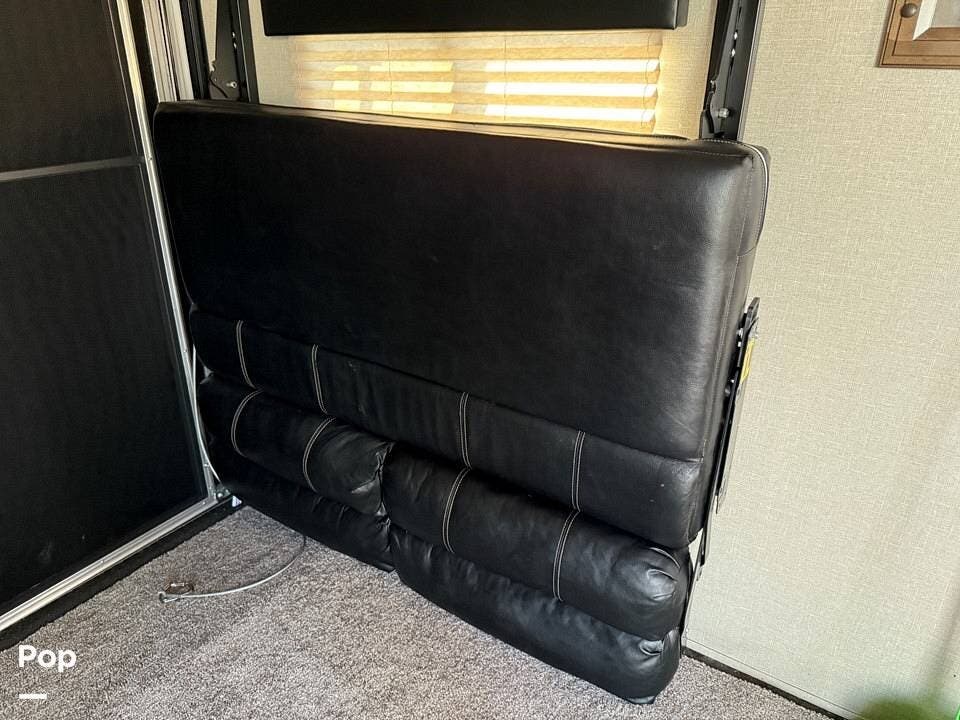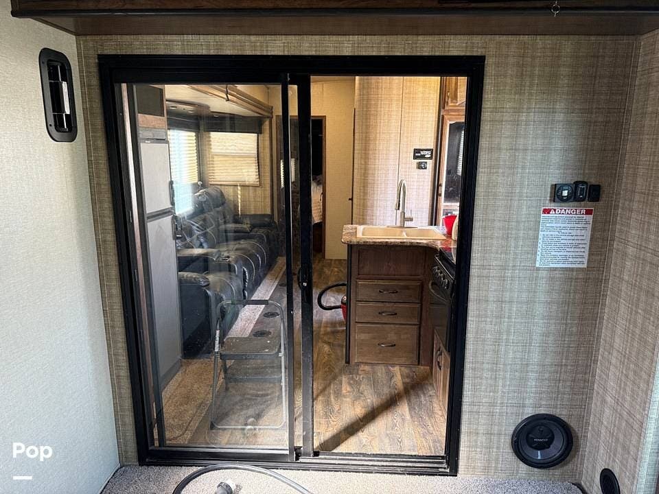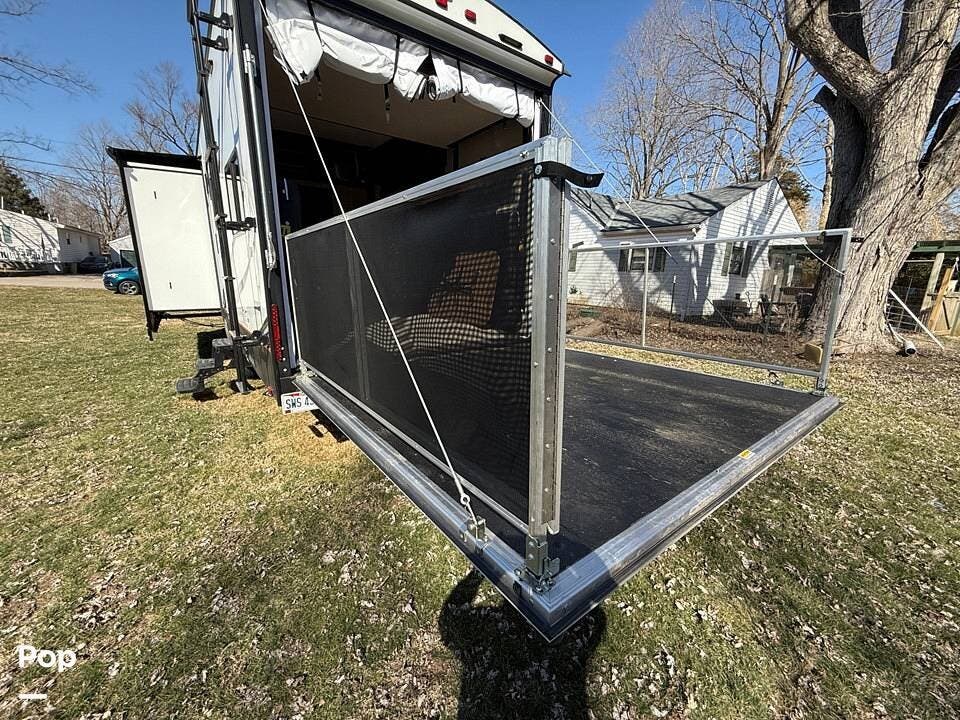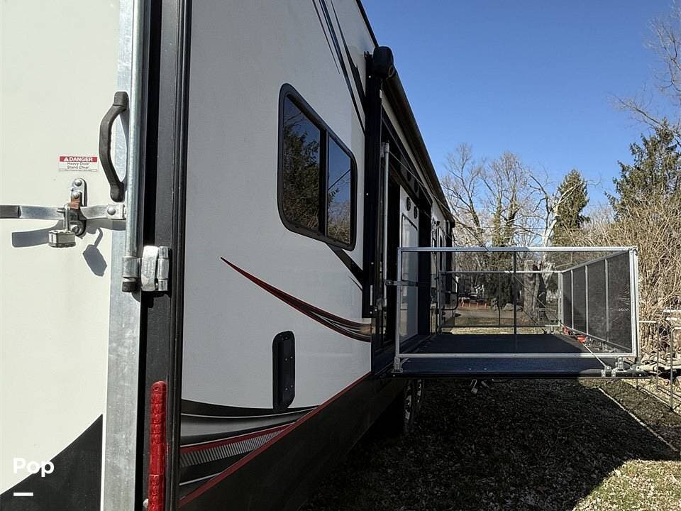 The master bedroom offers a spacious queen-sized bed, while the full bathroom ensures comfort on the go. Stay cool in any climate with two AC units and enjoy the benefits of being solar-prepped for off-grid capabilities. With two patios for outdoor enjoyment, this toy hauler is designed for those who love adventure without sacrificing luxury.