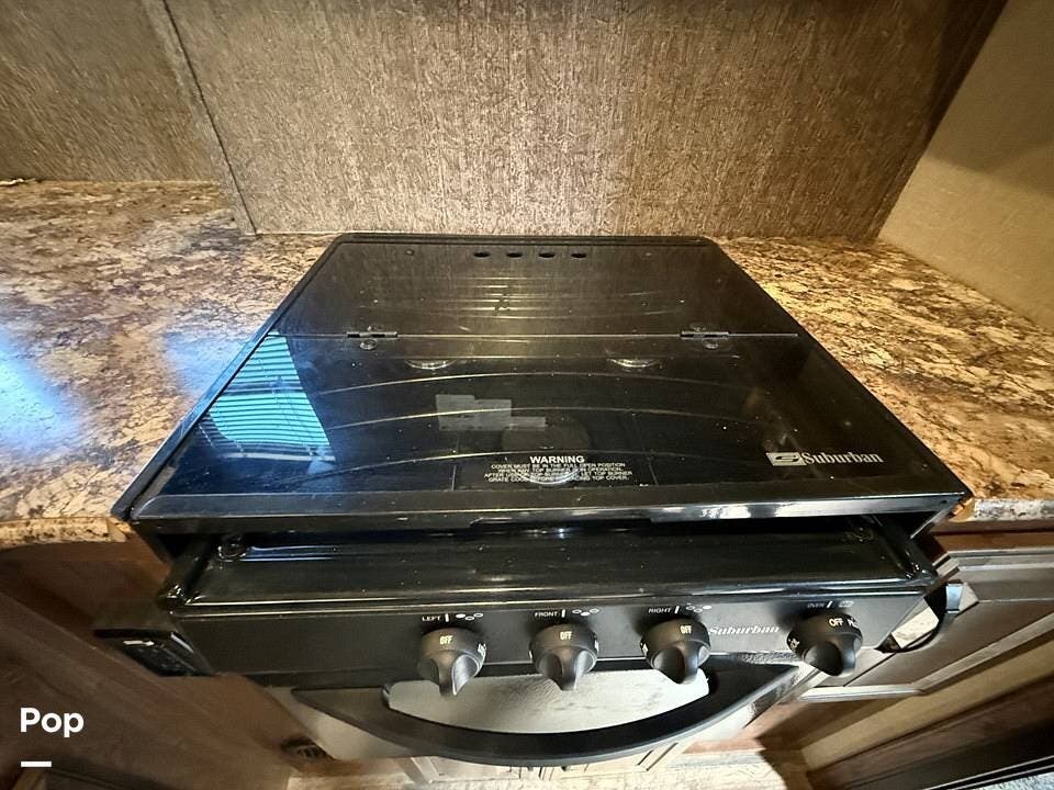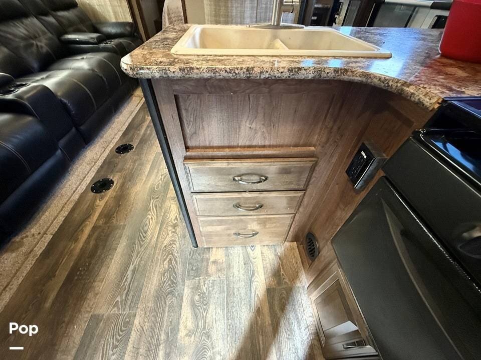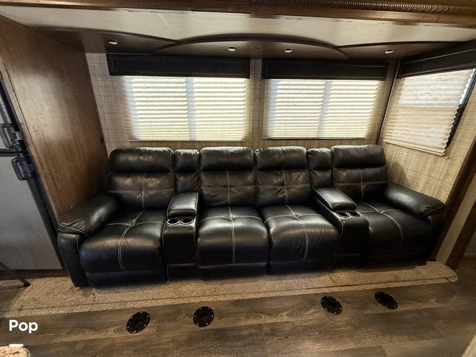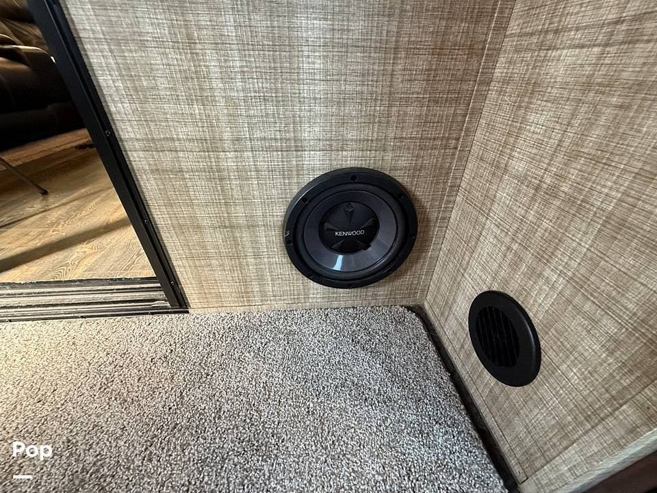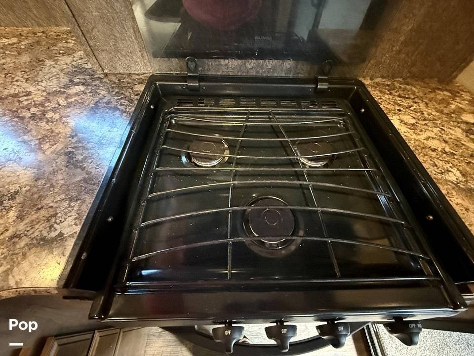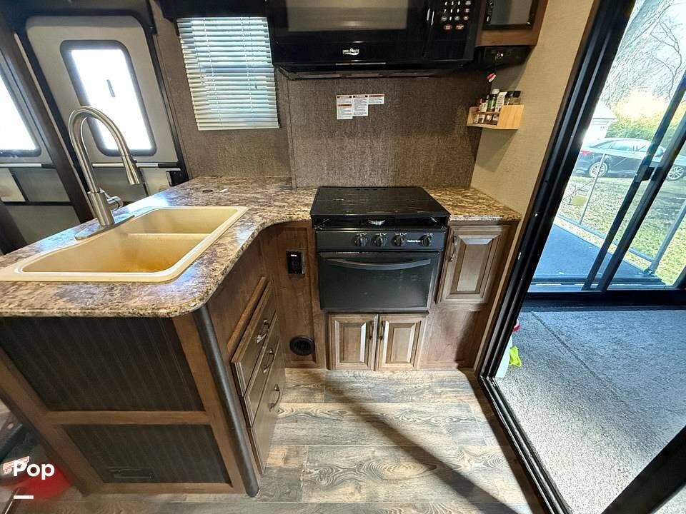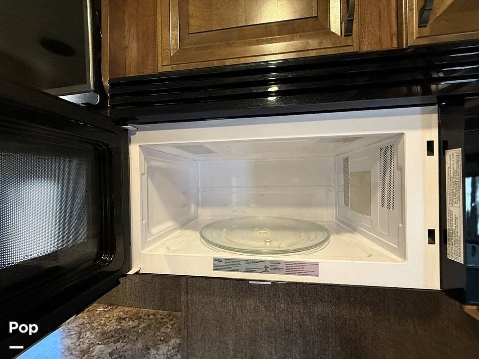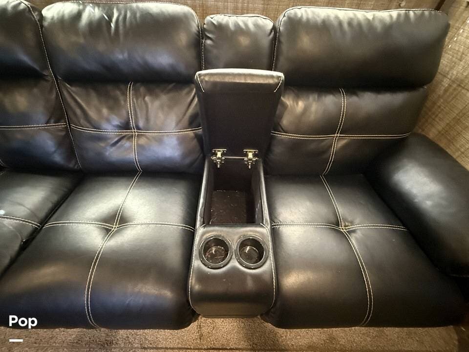 Relax in style with theater seating for four, three TVs, including one on the outdoor patio, and surround sound for an immersive entertainment experience. The kitchen is fully equipped with a dual-bowl sink, three-burner stove with oven, microwave, and refrigerator, making meal prep a breeze.