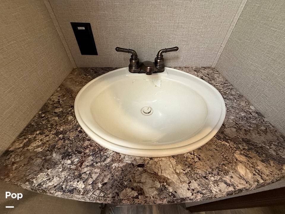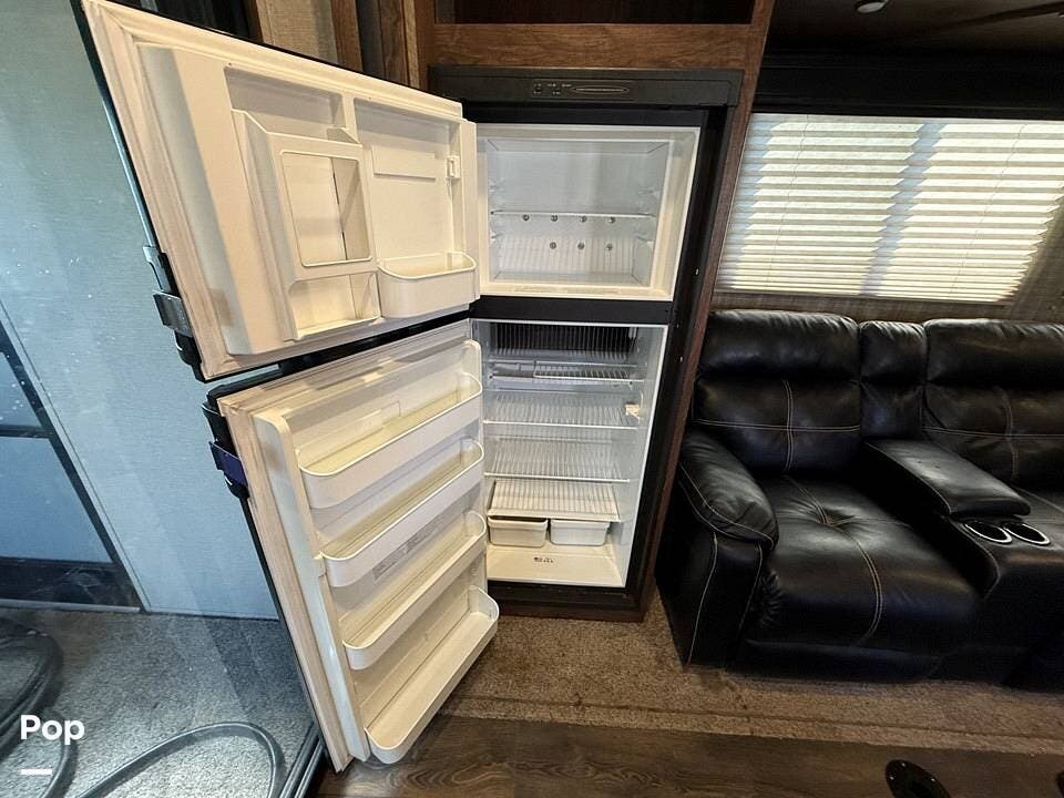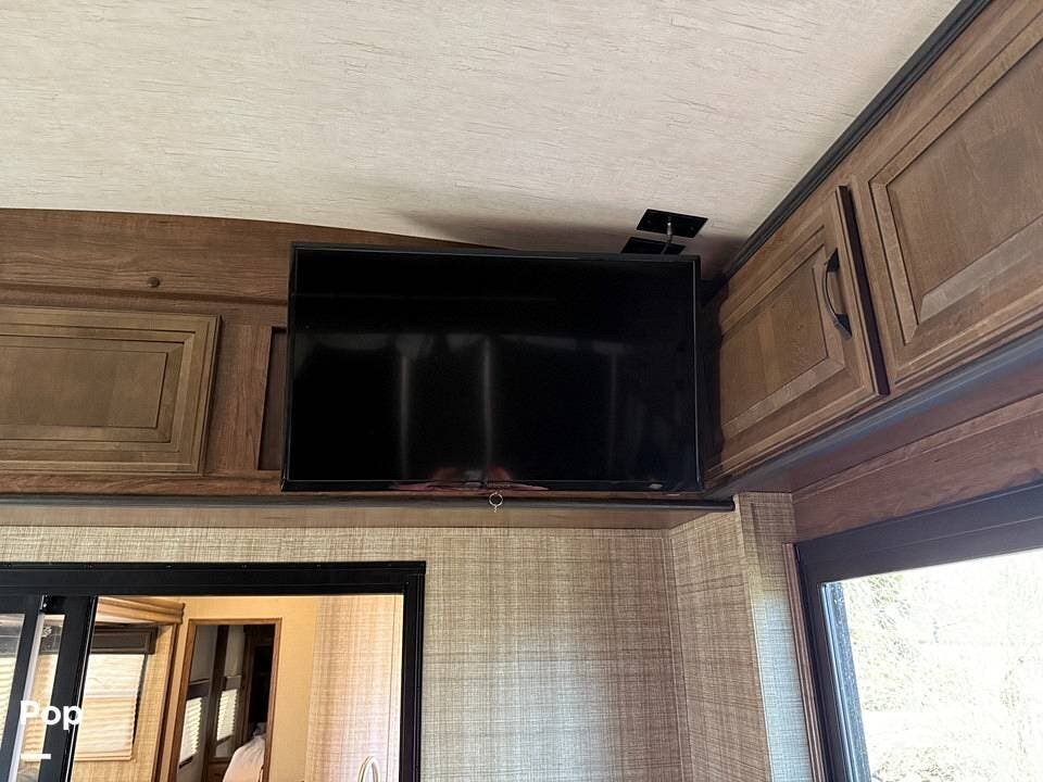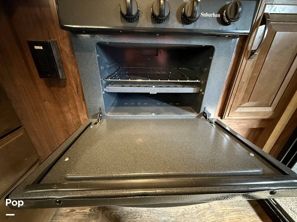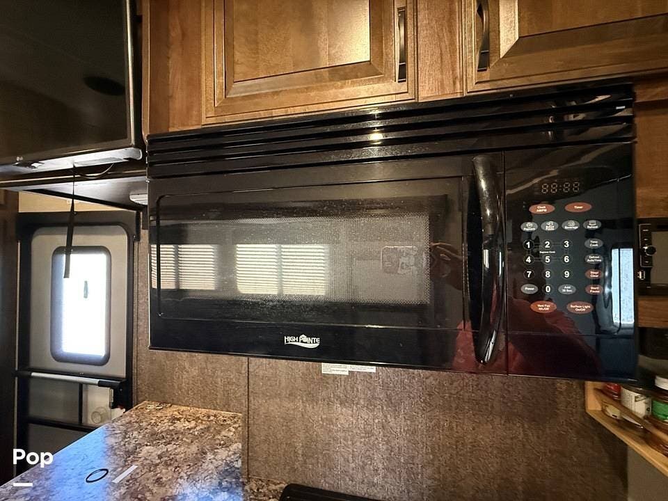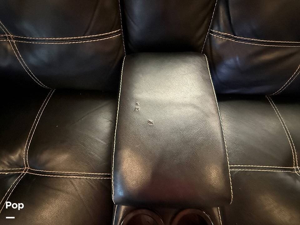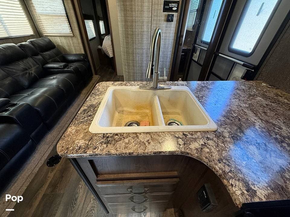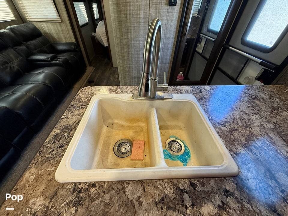 Relax in style with theater seating for four, three TVs, including one on the outdoor patio, and surround sound for an immersive entertainment experience. The kitchen is fully equipped with a dual-bowl sink, three-burner stove with oven, microwave, and refrigerator, making meal prep a breeze.