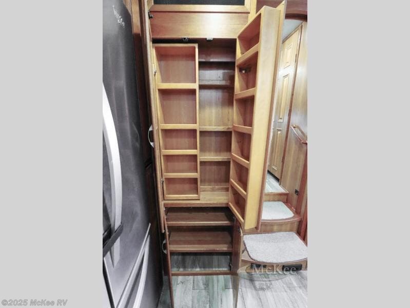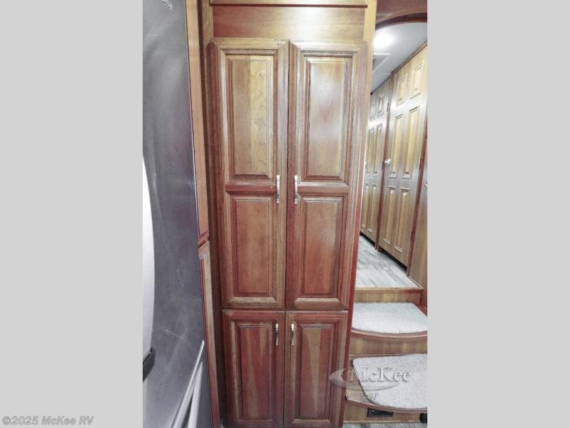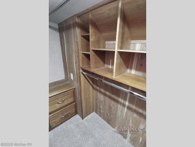 Head up the steps to a side aisle bath featuring a corner tub/shower, linen cabinet, sink with medicine cabinet overhead, and toilet. Out in the hall across from the bedroom find a slide out wardrobe prepped for a washer dryer that also includes a front king bed and nightstand. The wall opposite the bed is where you will find a vanity with drawers including overhead cabinets and a space for a TV overhead in the center. The front wall features a walk-in closet with dresser, and shelves, plus so much more!
