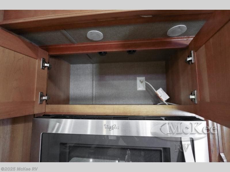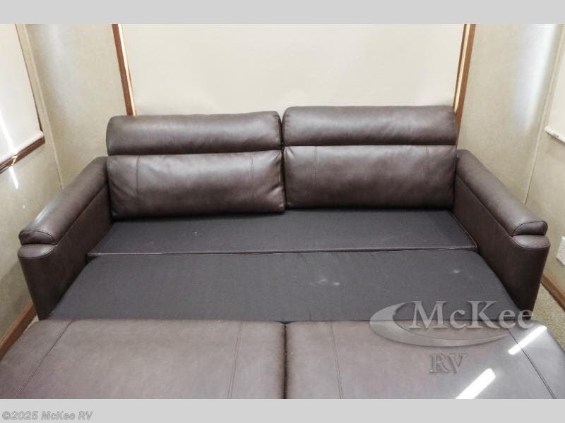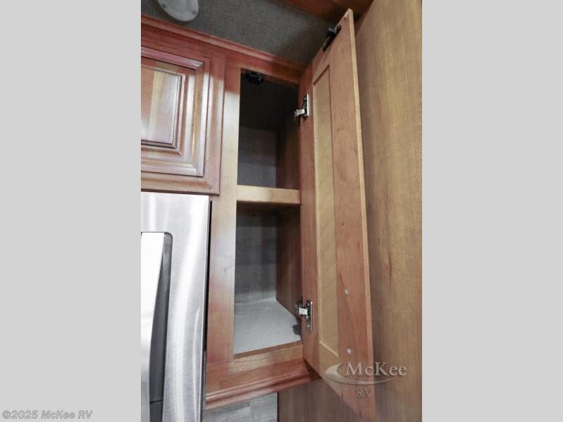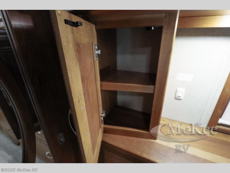 Along the rear wall find a sofa and an overhead cabinet. The sofa provides ample seating and perfect viewing of the power lift TV in the slide out opposite the door side. Within that same slide out find a storage cabinet for your things, plus a range with convection oven, counter space, and a refrigerator. More storage is located just inside the main entry door where you will find a coat closet and pantry.
