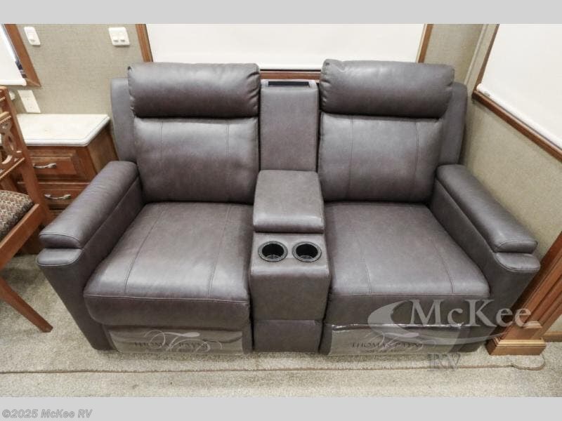The kitchen and living area feature dual opposing slide outs with a dinette slide to the left of the entry door where you will also find two theatre seats as well. There is also plenty of overhead storage throughout.