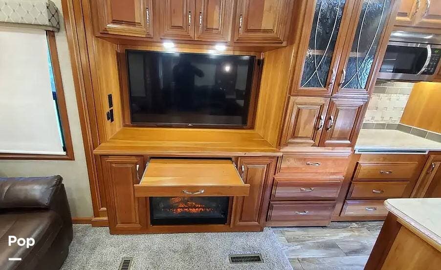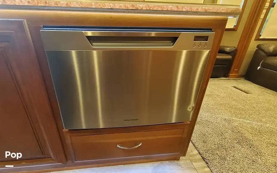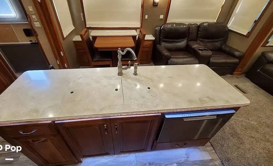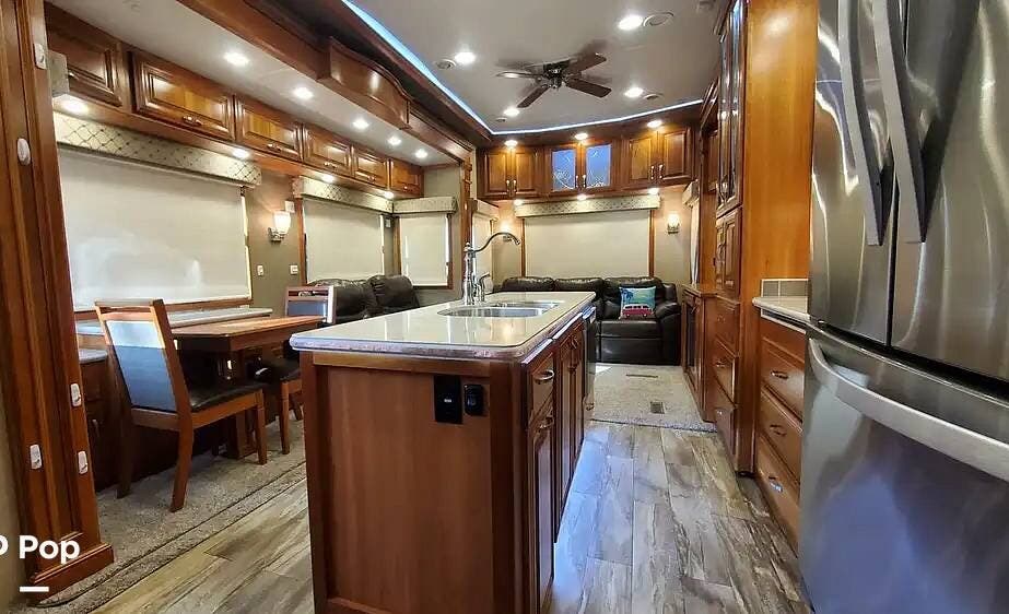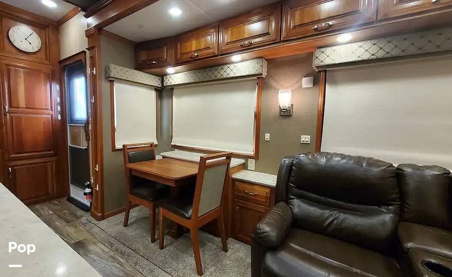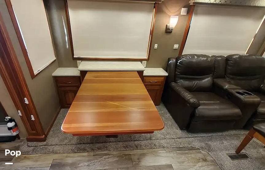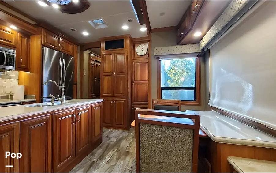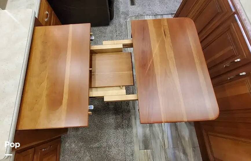 The cherry trim and cabinets, with soft-close drawer glides, rival the workmanship found in custom homes. The custom cherry dinette table features a hidden leaf for additional dining space.