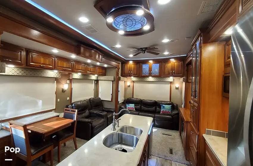 The living room has a full-width leather sofa with a hide-a-bed, theater seats, and a center console, so you can relax and enjoy the fireplace and LED flatscreen TV.