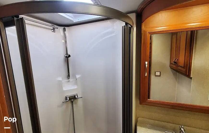 The full bath features a large corner shower, a floor-to-ceiling linen closet, a vanity with a deep bowl, and a residential-style faucet. The mirrored medicine cabinet and overhead cabinets proved ample storage.