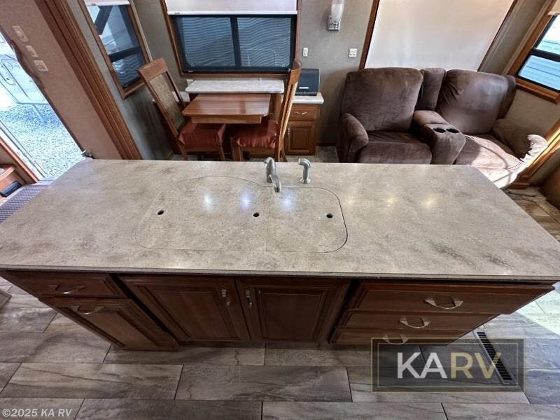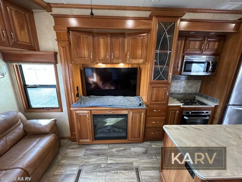 Back down to the main living area find a dinette with chairs and theatre seats with cup holders in a slide out to the left of the entry door. A sofa along the rear wall provides more seating in the living area, and all seats have a great view of the entertainment center with power lift TV and optional fireplace that is featured in the slide out opposite the door. This slide is also shared by the kitchen amenities.